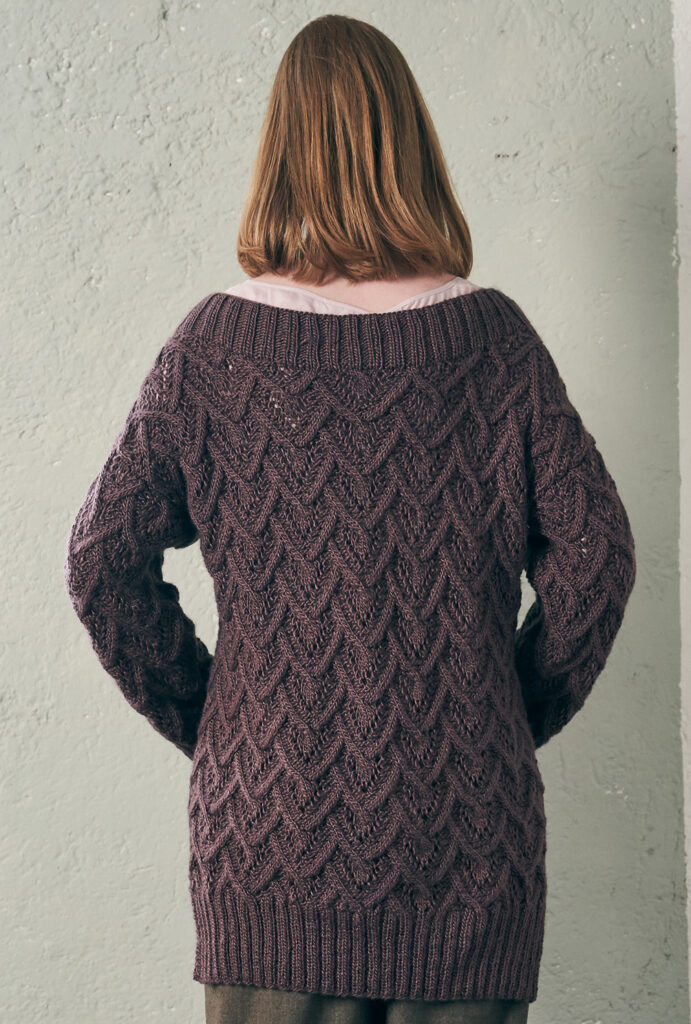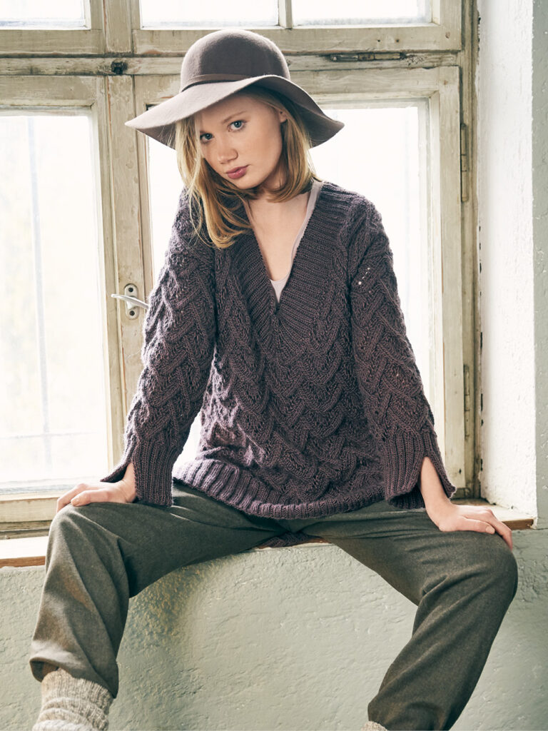 Sinnlicher Modetrend: Der tiefe V-Ausschnitt streckt die Silhouette durch die vertikale Blickführung und ist ein echter Dekolleté-Schmeichler. Dieses Design bietet aber noch mehr: Auch Schlitze an den Ärmeln und unteren Seitenrändern machen Furore – sie lassen einen echten Statement-Pulli in geheimnisvollem Violett entstehen. Ein weiteres Highlight bietet das plastische Ajour- Zopfmuster. Das benötigt zwar ein wenig Aufmerksamkeit und Erfahrung, aber die klare Strickschrift in der Anleitung hilft dabei, stets den Überblick zu behalten. Gestrickt wird in einzelnen Teilen von unten nach oben – sind alle Teile fertig werden noch die Nähte geschlossen und die Blende des V-Ausschnitts gestrickt – wie hierbei eine ganz saubere Spitze gelingt, erklärt die Anleitung Schritt für Schritt. Am besten nimmt der fertige Pullover jetzt noch ein kleines Bad und wird im Liegen getrocknet. Dabei schön in Form bringen und glattstreichen – so öffnet sich das Lacemuster und entfaltet seine ganze Pracht.