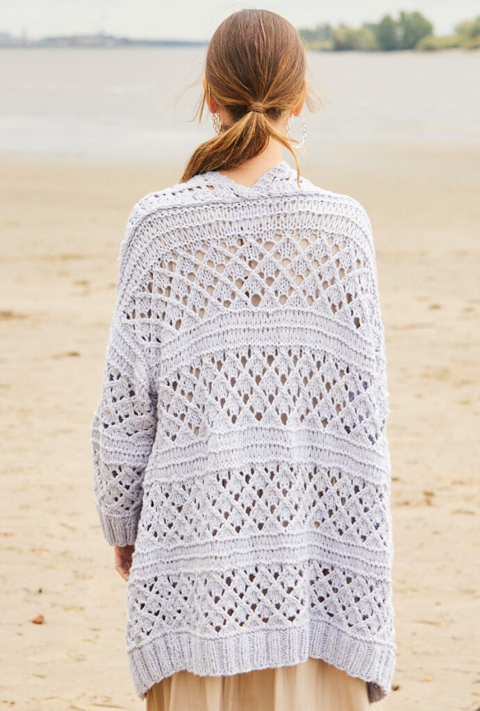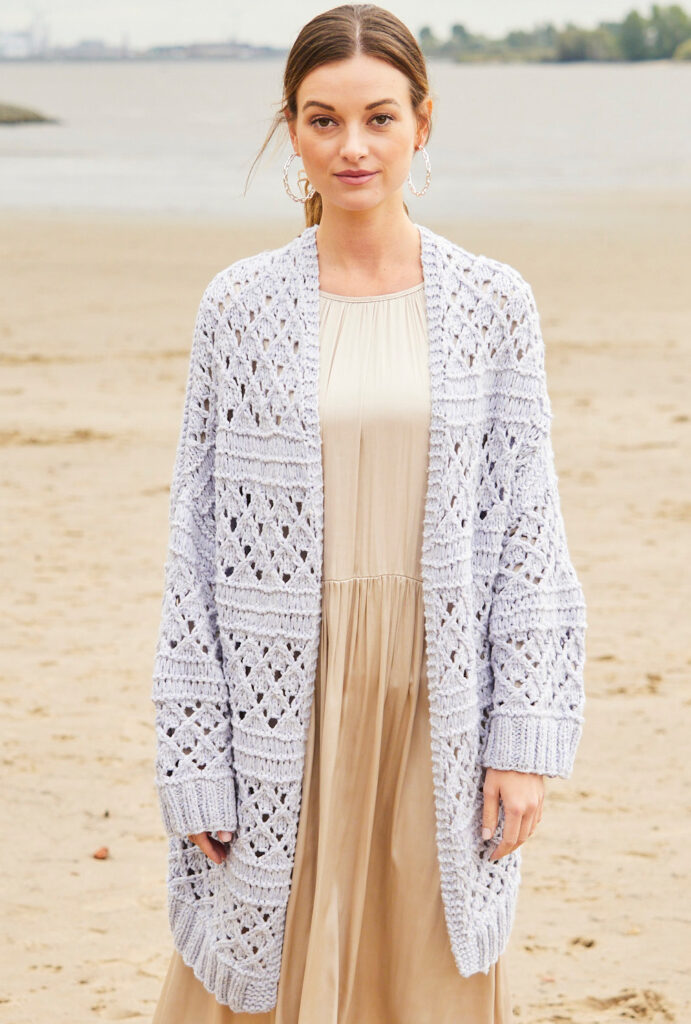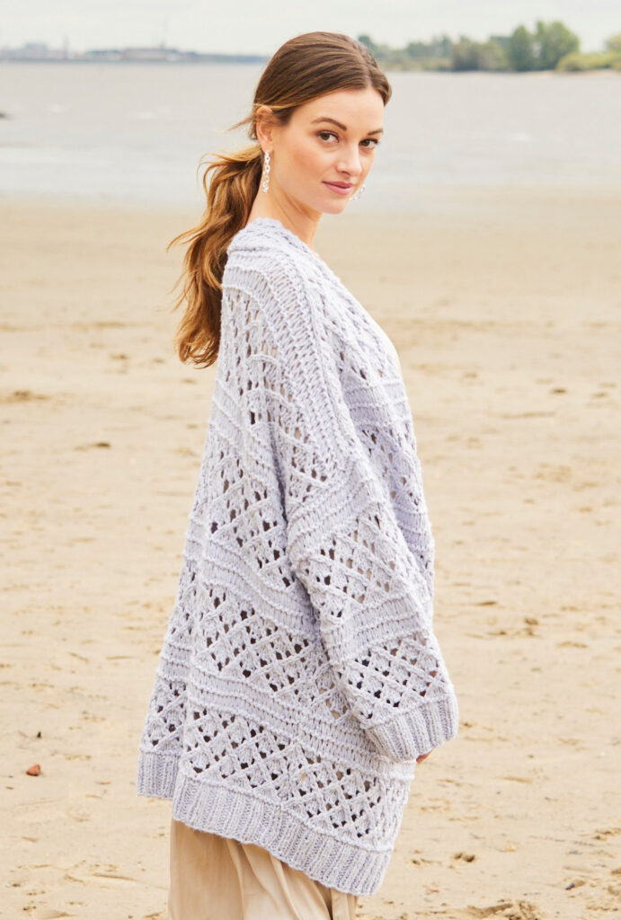 Du liebst Muster und voluminöse Garne? Dann kommt hier dein nächstes Projekt. Diese Jacke besitzt noch dazu einen wirklich uniquen Schnitt. Durch die schräg endenen Vorderteile kommt richtig Dynamik ins Spiel. Das ist auch gar nicht kompliziert. Durch die ausführliche Strickschrift, detailierter Schnitt und Beschreibung erfährst du ganz genau, auf was du achten musst. Die Teile werden vorher einzeln von unten nach oben gestrickt. Die verschlusslose Blende, Musterwechsel im Ajourmuster, Fallmaschen und die Bündchen im Rippenmuster machen das Stricken richtig spannend. Gearbeitet wird in Nadelstärke 6,5 und 7 in den Größen 36 – 40 und 42 – 46.
