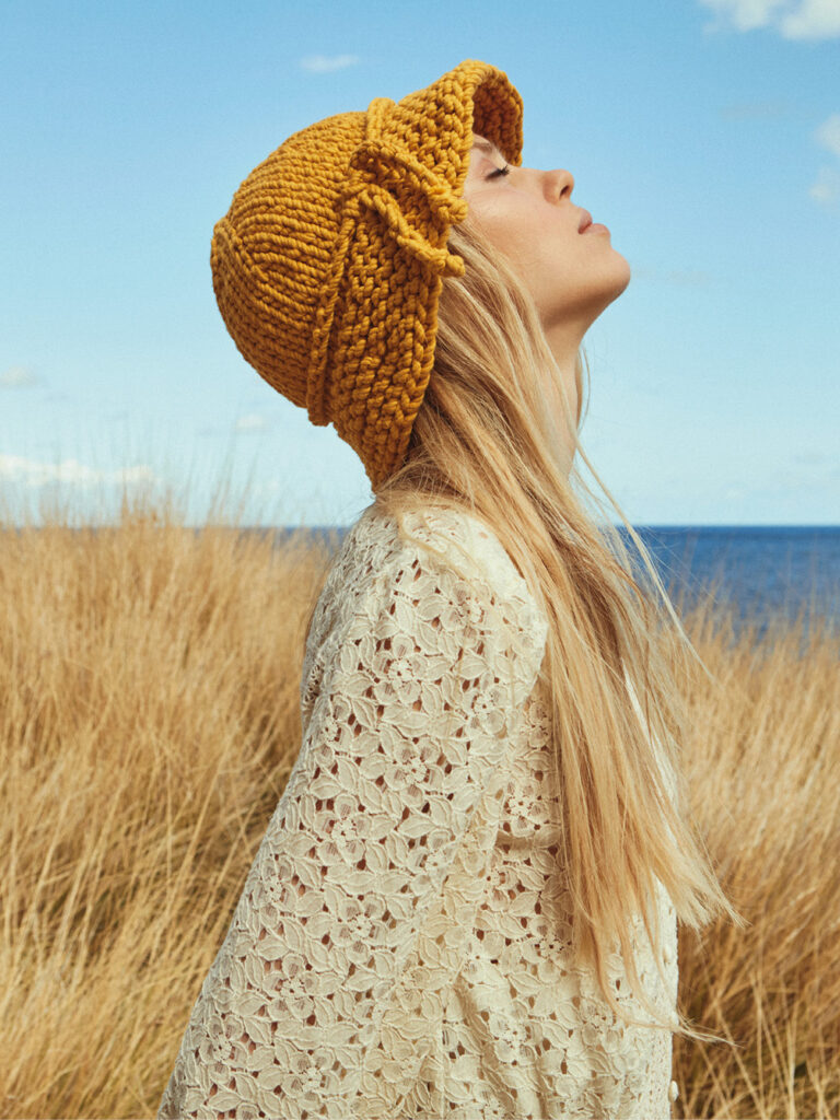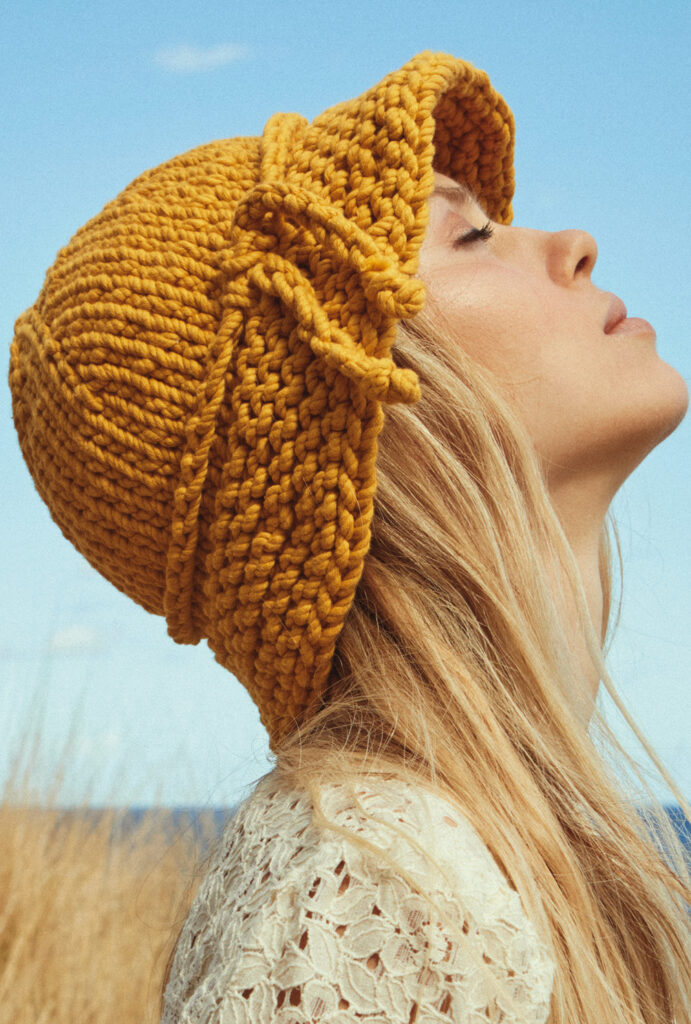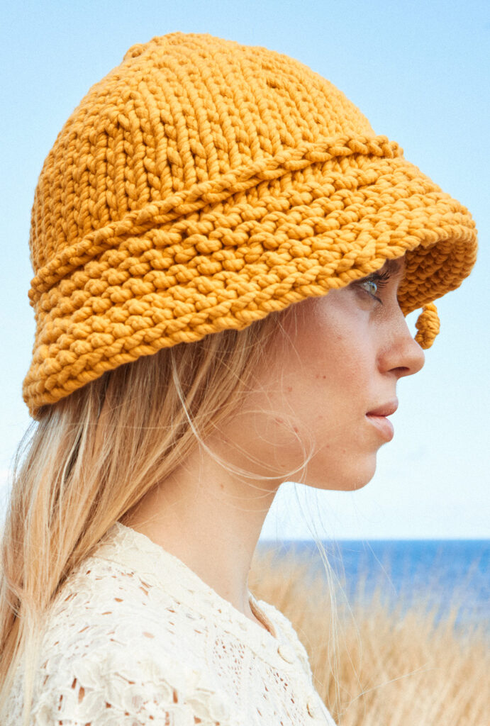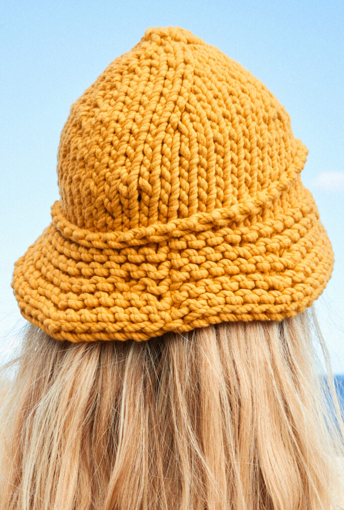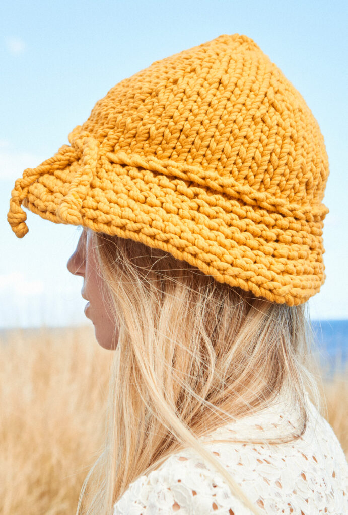 Auch wenn die Sonne noch nicht mit voller Kraft scheint – ein Hut tut immer gut! Er wird aus einem dicken, senfgelben Kordelgarn glatt rechts in Runden gestrickt und ist im Nu fertig. Damit der Strickhut auch genügend Stand hat, ist es wichtig ganz besonders fest zu stricken. Gearbeitet wird deine neue Kopfbedeckung von innen nach außen in Runden. Erst mit dem Nadelspiel, wenn es immer mehr Maschen werden kann es später vorteilhaft sein, auf eine Rundstricknadel zu wechseln. Zum Schluss wird noch eine Schnur gehäkelt und um den Hut gelegt, dabei die Enden jeweils durch eine Masche ziehen. So gewinnt der Sonnenhut zusätzlichen halt und kann auch einer kräftigen Meeresbrise standhalten.
