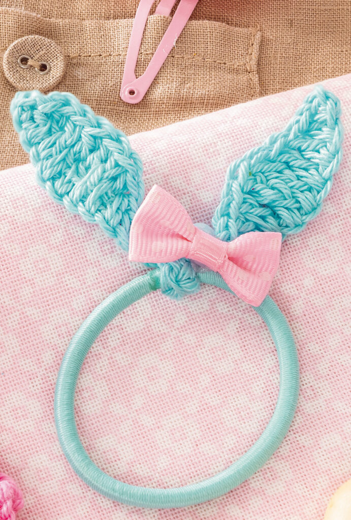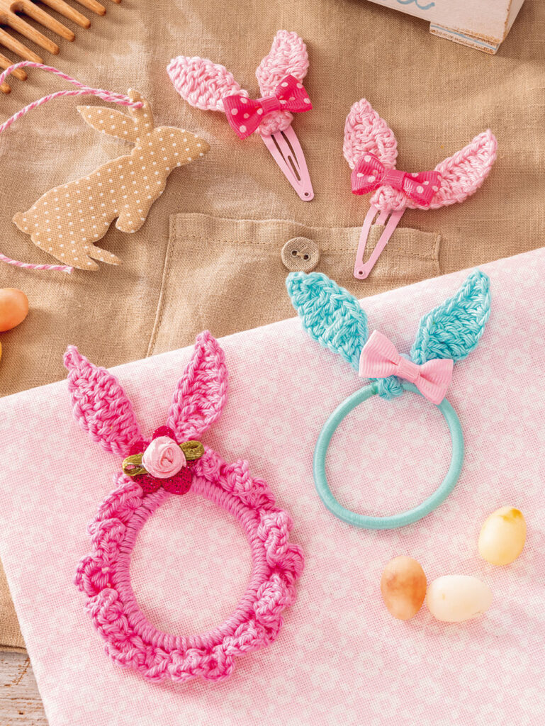 Diese niedlichen Haarspangen und Haargummis mit Hasenohren sind als Kinder-Haarschmuck das perfekte Ostergeschenk oder Mitbringsel für kleine Fashion-Stars. Dazu werden Haargummis und Haarspangen mit Hasenohren in Rosa und Hellblau um- bzw. behäkelt. Gehäkelt werden dafür feste Maschen, halbe Stäbchen, Stäbchen und Doppelstäbchen. Zum Schluss werden die Haargummis und Haarspangen noch ganz nach Geschmack mit Satin- oder gepunkteten Stoffschleifen oder Satinröschen auf Glitzerfilz verziert. Das Nacharbeiten ist dank der ausführlichen Anleitungen auch für etwas ungeübtere kleine und große Häklerinnen problemlos möglich.