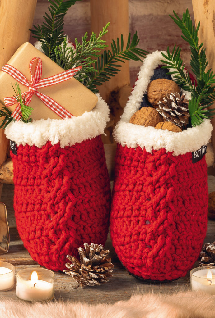 Diese roten Weihnachts-Botties mit weißem Kuscheleinstieg sorgen garantiert für wohlig warme Füße in der kalten Jahreszeit. Basis für die gemütlichen Hausschuhe bilden die Sohlen in den Schuhgrößen 37/38 (39/40) 41/42 mit Filzeinlegesohlen von mabottie GmbH. Das Modell eignet sich für fortgeschrittene Häkler:innen; gehäkelt wird mit Kettmaschen, festen Maschen, halben Stäbchen, Stäbchen und Doppelstäbchen sowie Relief-Stäbchen und Relief-Doppelstäbchen. Dank der voluminösen Wolle und der ausführlichen Anleitung mit zahlreichen Schritt-für-Schritt-Fotos und -Zeichnungen inklusive Häkelschriften sind sie zudem auch noch schnell vor dem Weihnachtsfest gehäkelt.