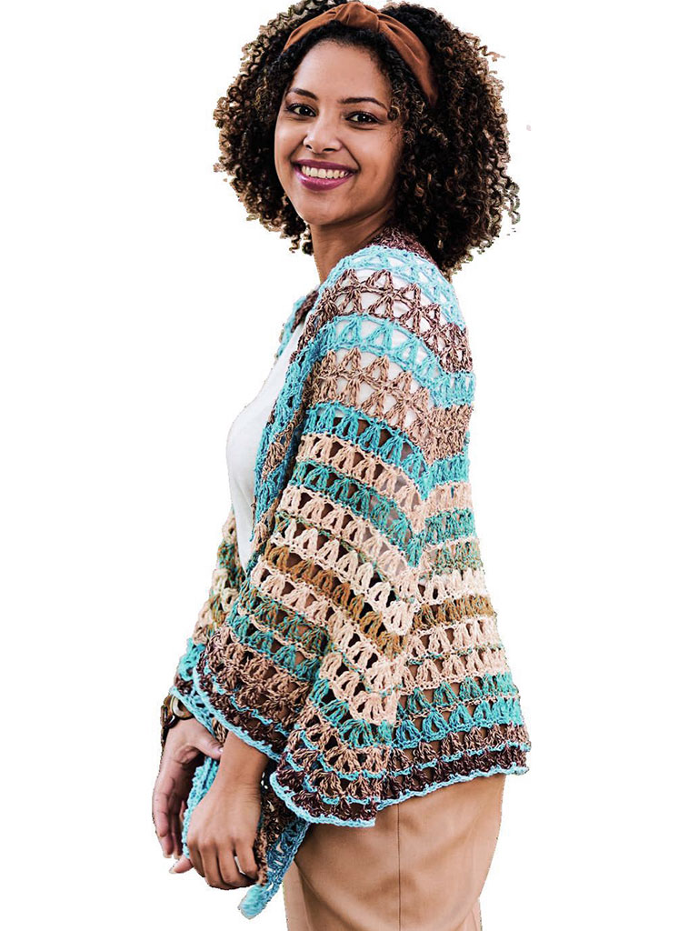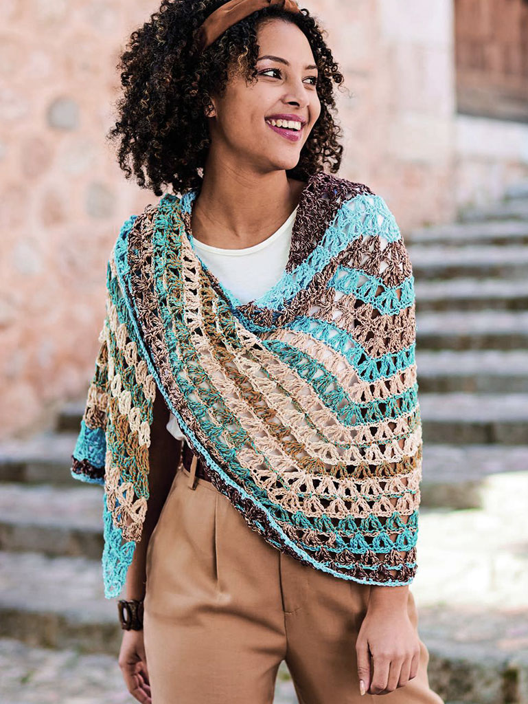 Dieses Tuch ist ein muss für den Sommer, denn egal ob ein leichter Sonnenschutz am Strand oder Abends wenn es kühler wird – das Tuch gehört immer dazu. Es wird mit zwei Spitzen gehäkelt, sodass es fast halbrund wirkt. Das große luftige Muster passt gut zu den Streifen die durch das Garn ganz von alleine entstehen und super schnell von der Hand gehen. Hier wechseln sich Hell- bis Dunkelbraune und Türkisfarbene Streifen ab.