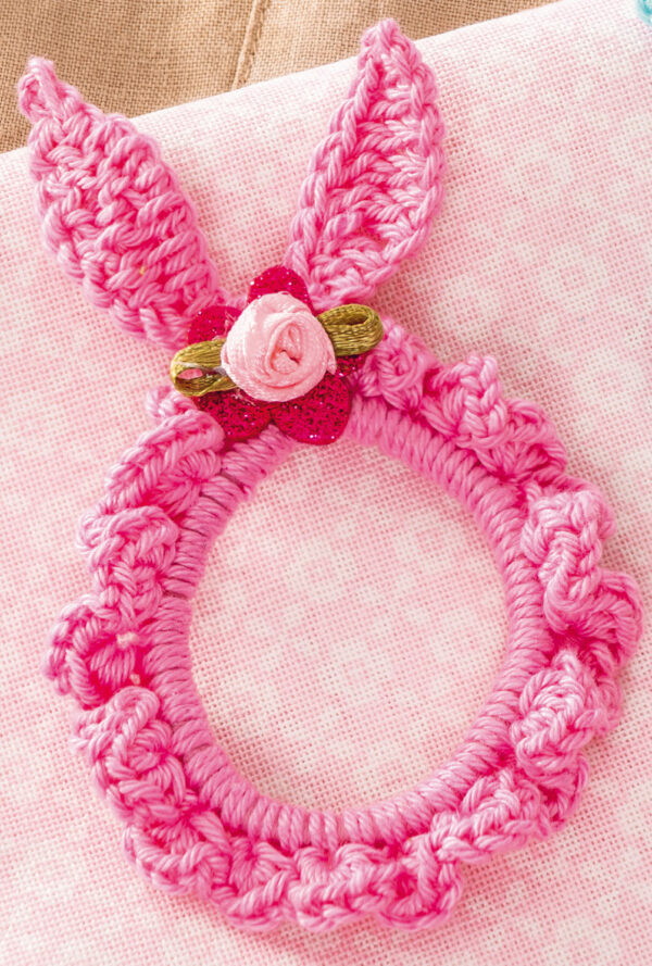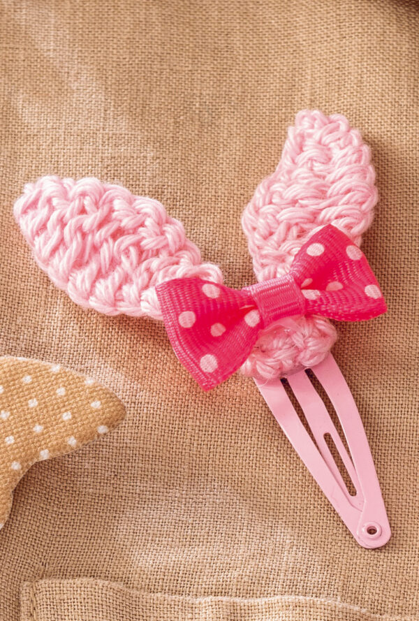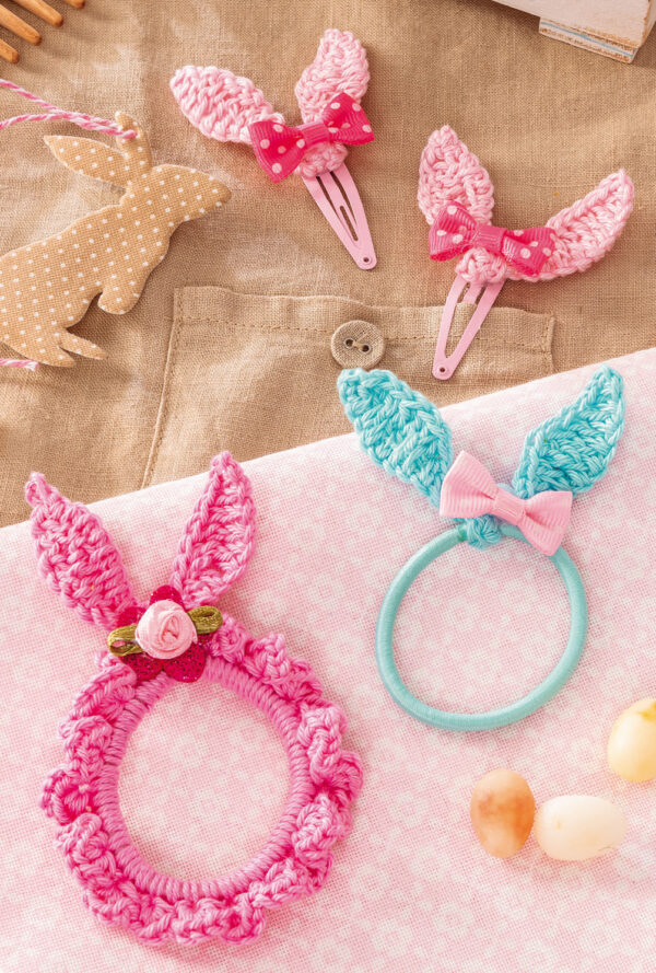 Gehäkelte Haarspangen und Haargummis in Rosa und Hellblau