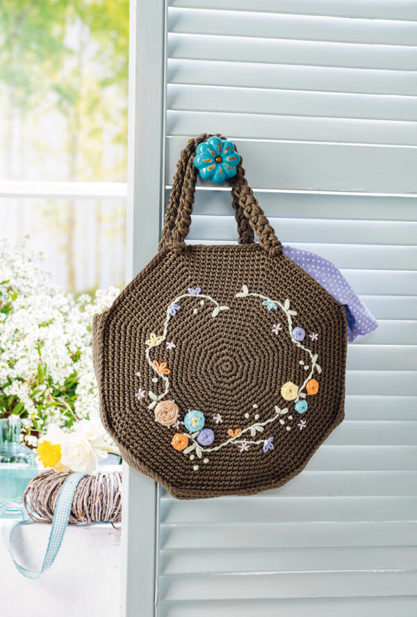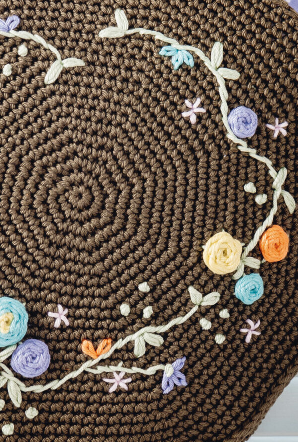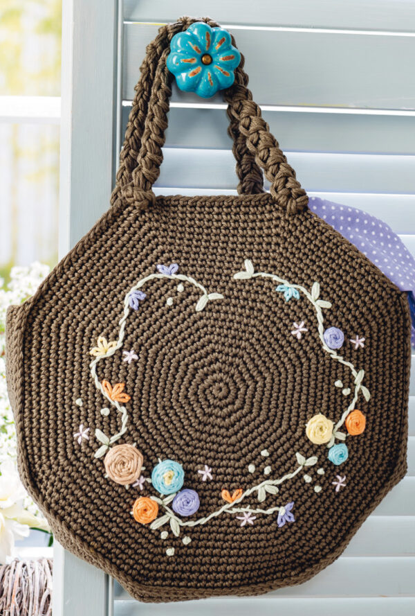 Olivgrüne Häkeltasche mit aufgestickten bunten Blütenranken