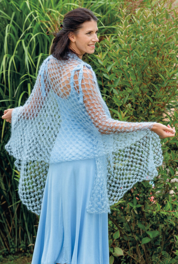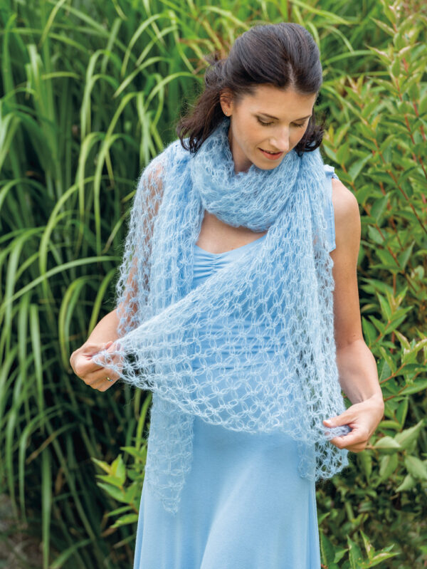 Gehäkeltes hellblaues Tuch mit Salomonsknoten