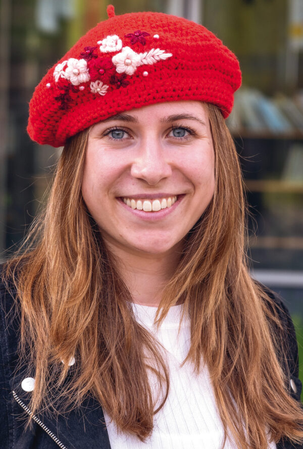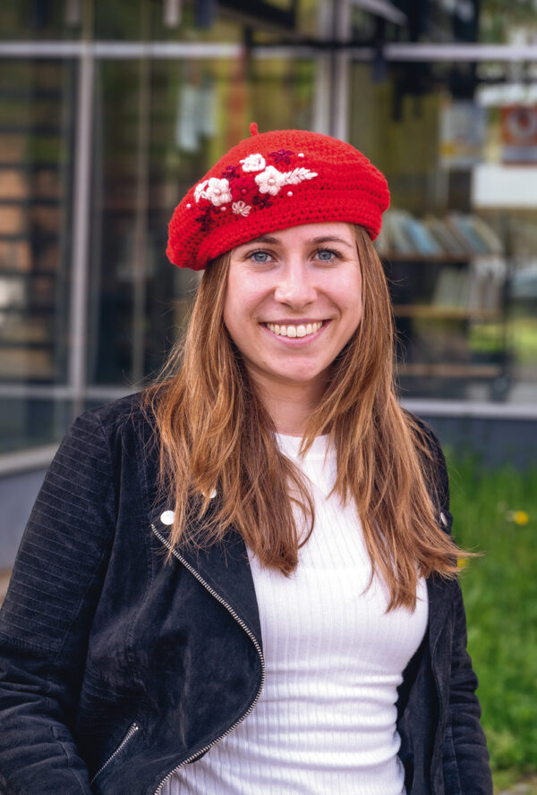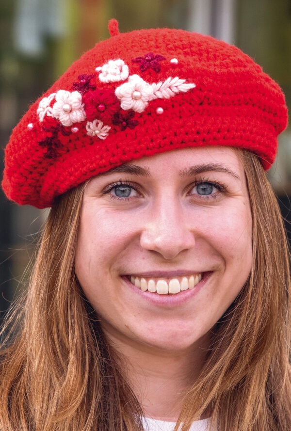 Gehäkelte Baskenmütze in Rot mit Häkelblüten