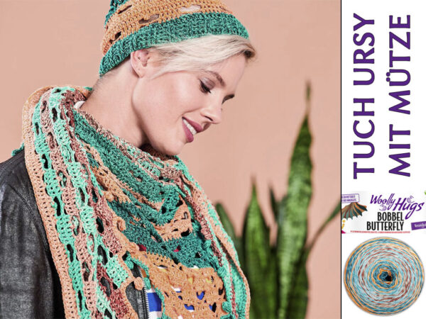 Woolly Hugs Tuch Ursy mit Mütze, ein tolles Set in Türkis und Orange in Streifen