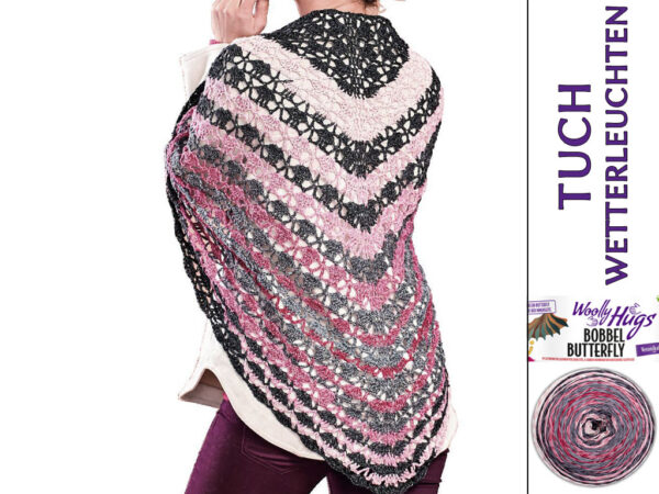 Woolly Hugs Bobbel-Tuch gehäkelt, in sanften Farben von Rosa bis Rot mit Grau als Kontrastfarbe