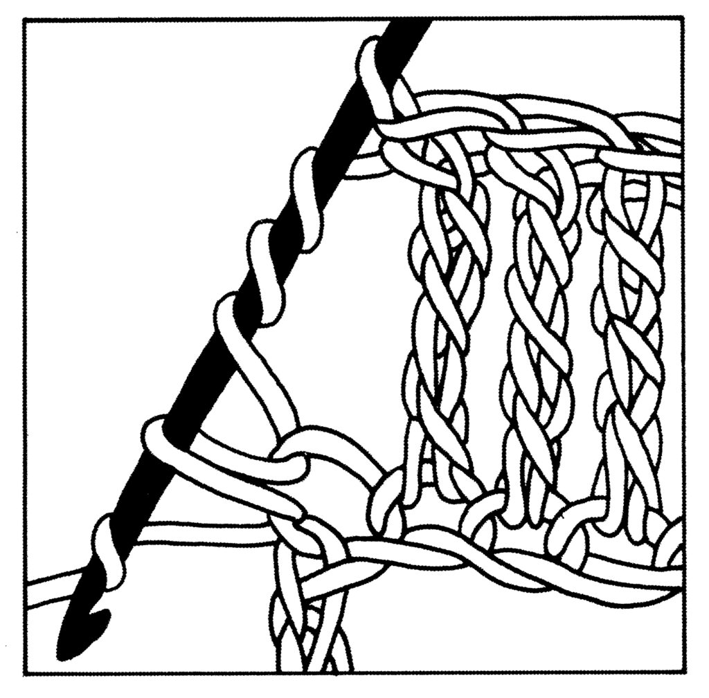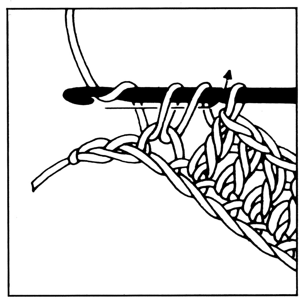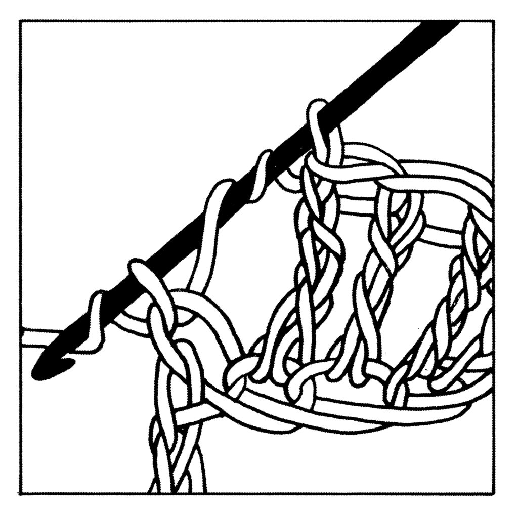 Feste Maschen: Für jede fM eine Schlinge durchholen, einen Umschlag aufnehmen und durch alle auf der Nadel liegenden Schlingen ziehen.