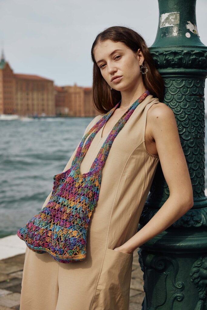 Hier werden traditionelle Granny-Squares mit einfachen Mustern und Farbkombinationen gehäkelt. Diese zeitlosen Häkel-Quadrate passen perfekt zu einem gemütlichen Boho-Look oder als verspieltes Accessoire zu einem schlichten Outfit.