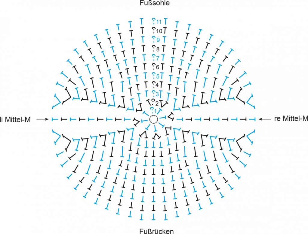 Arbeite nun für den Fuß gerade weiter. Für die Fußlänge so viele Runden oder cm häkeln, wie in der Tabelle bzw. in der Anleitung angegeben. Eventuell die Markierungen durch das Versetzen der Häkchen oder Hochziehen des Fadens mit nach oben nehmen. Danach für Rist und Ferse in jeder folgenden Runde in die Masche vor und nach der rechten Mittelmasche und vor und nach der linken Mittelmasche je 2 halbe Stäbchen arbeiten. Diese Zunahmen so oft wiederholen, wie aus der Tabelle oder Anleitung hervorgeht.