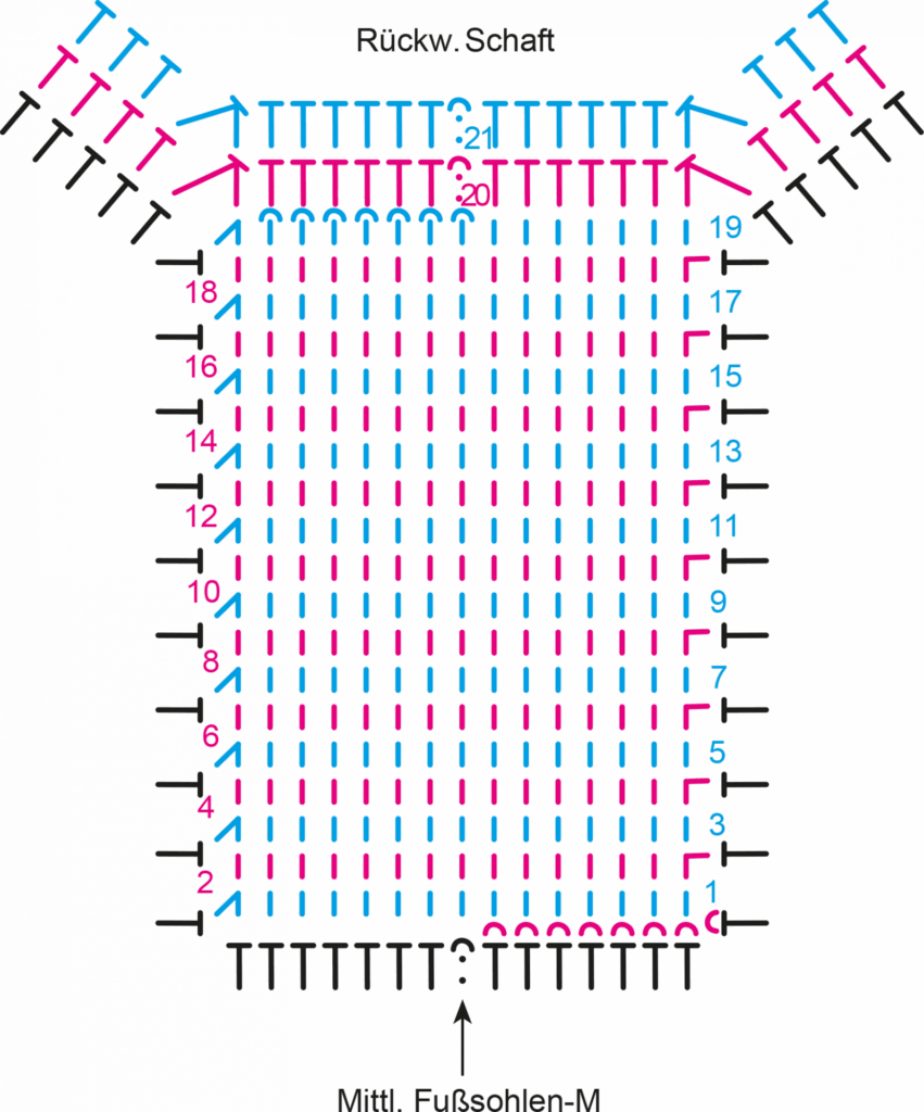 Der Schaft beginnt mit dem Ende des Käppchens – also mit der 18. Runde der Häkelschrift 2. Anschließend zur Formgebung je nach Größe zusätzliche Abnahmen wie in der 19. und 20. Runde gezeichnet arbeiten. Dies ist in der Tabelle bzw. Anleitung beschrieben. Daraufhin ist wieder die ursprüngliche Maschenzahl des Fußes erreicht. Nun den Schaft wie beschrieben oder nach gewünschter Länge beenden. Und fertig ist deine gehäkelte Socke!
