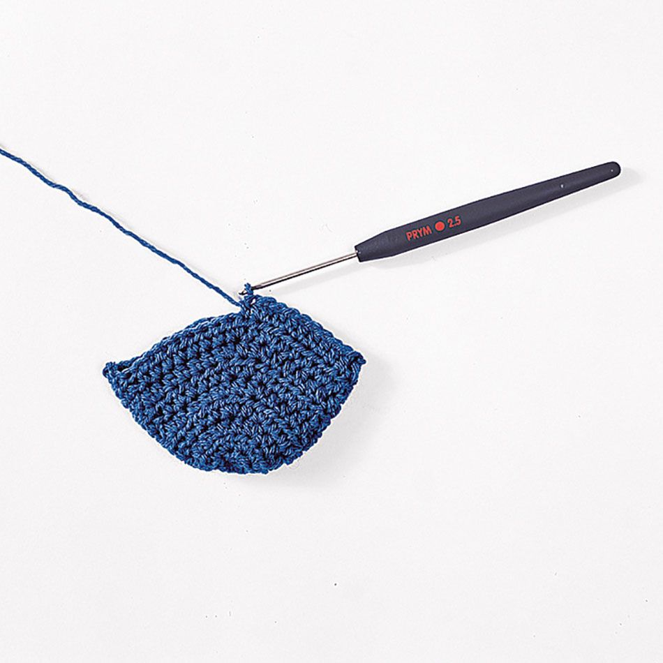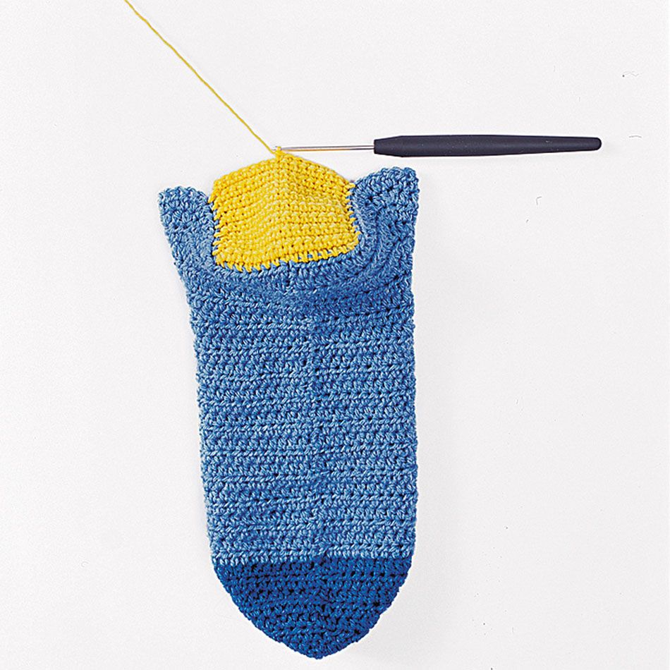 Dann die Arbeit wenden und laut Häkelschrift 2 weiterarbeiten. In der ersten Käppchen-Reihe werden zu Beginn und am Ende 2 feste Maschen zusammen abgemascht. Daraufhin jeweils am Ende jeder Reihe 2 Maschen zusammen abmaschen. Dafür in die letzte Masche des Käppchens einstechen, Faden holen und durchziehen. Dann in die folgende Masche des seitlichen Fersenrandes einstechen, Faden holen und durchziehen. Zuletzt Faden holen und durch alle auf der Nadel befindlichen Schlingen ziehen. Danach die Arbeit wenden und sofort wie gezeichnet in die zuletzt gearbeitete Masche 1 feste Masche häkeln. Laut Häkelschrift weiterarbeiten.