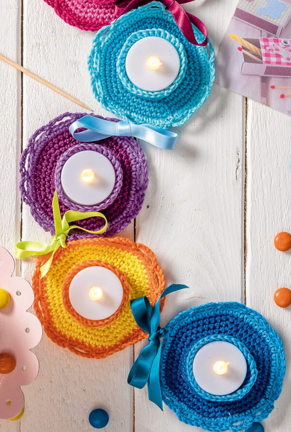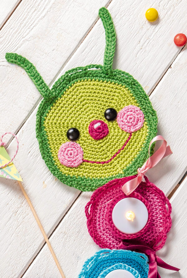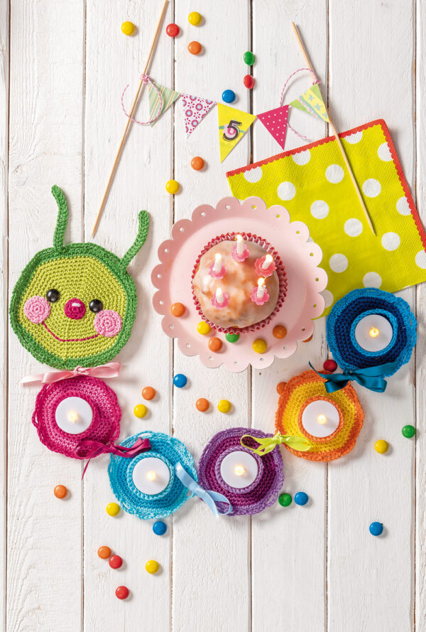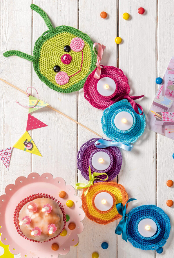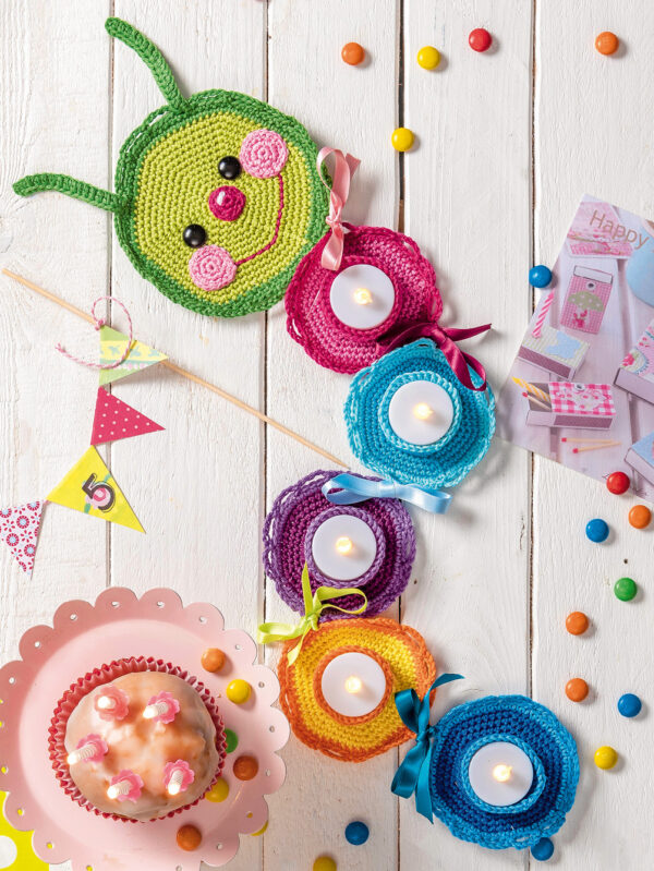 Gehäkelte Geburtstagsraupe mit Teelichtern