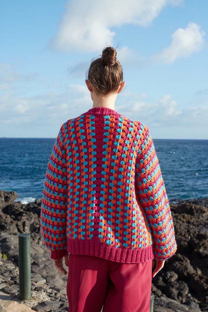 If you listen carefully, you hear the poems of the deep blue sea This awesome cardigan is both crocheted and knitted. The sleeves are slightly oversized but that gives the whole thing a funky look. This cardigan will slip off your crochet hook as well as your knitting needles in no time. Which color combination will you choose?