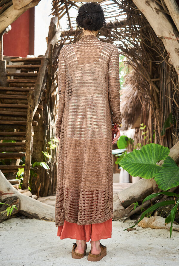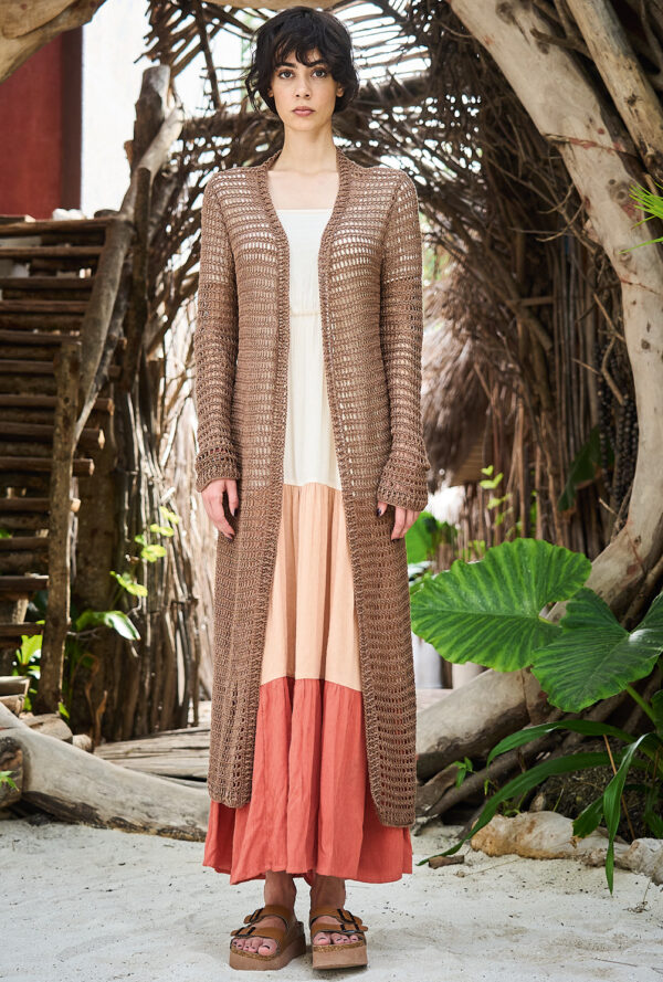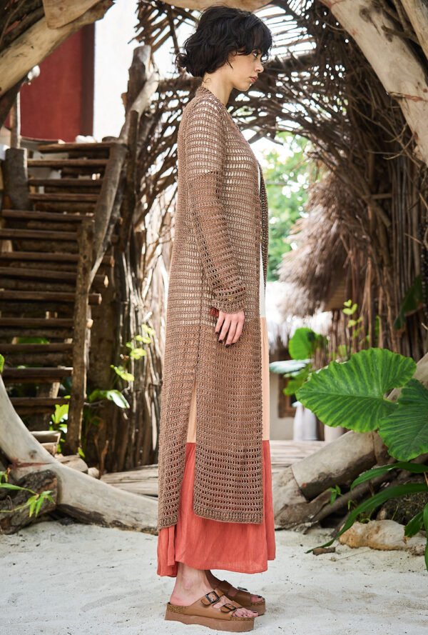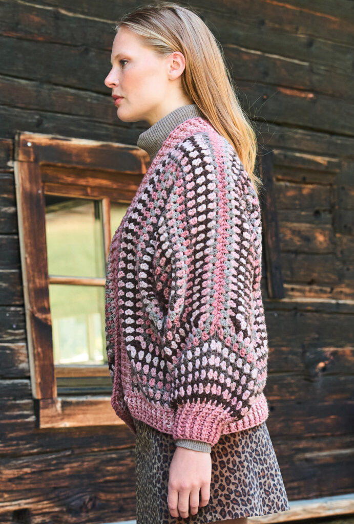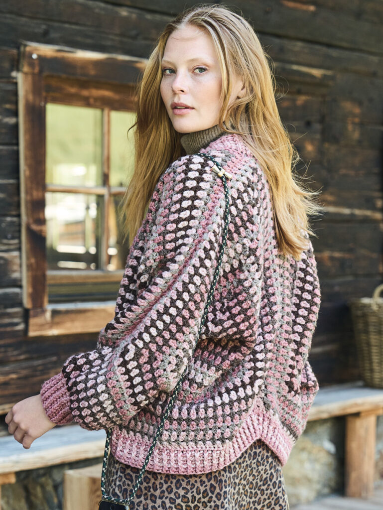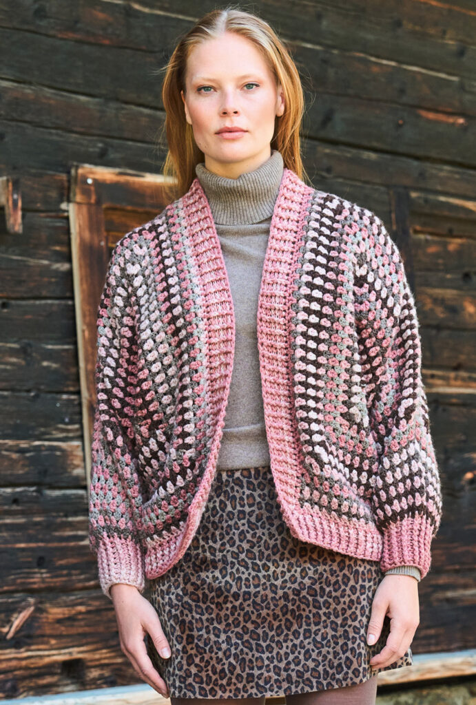 Beim Erstellen dieser Jacke brauchst du etwas räumliches Vorstellungsvermögen, denn sie besteht aus zwei Sechsecken, die zum Schluss nach unserem Schnitt zusammengenäht werden. Die Secksecke sind gehäkelt, und zwar aus Reliefstäbchen. Bei dieser Art von Stäbchen stichst du nicht in die Masche der Vorrunde ein, sondern führst die Nadel um die senkrechten Maschenglieder herum. Zusätzlicher Blickpunkt ist das Farbverlaufsgarn in warmen Rosa- und Brauntönen, das streifenweise zum Einsatz kommt. Das ganze Teil wird an den Rändern mit gestrickten Rippenblenden umsäumt.