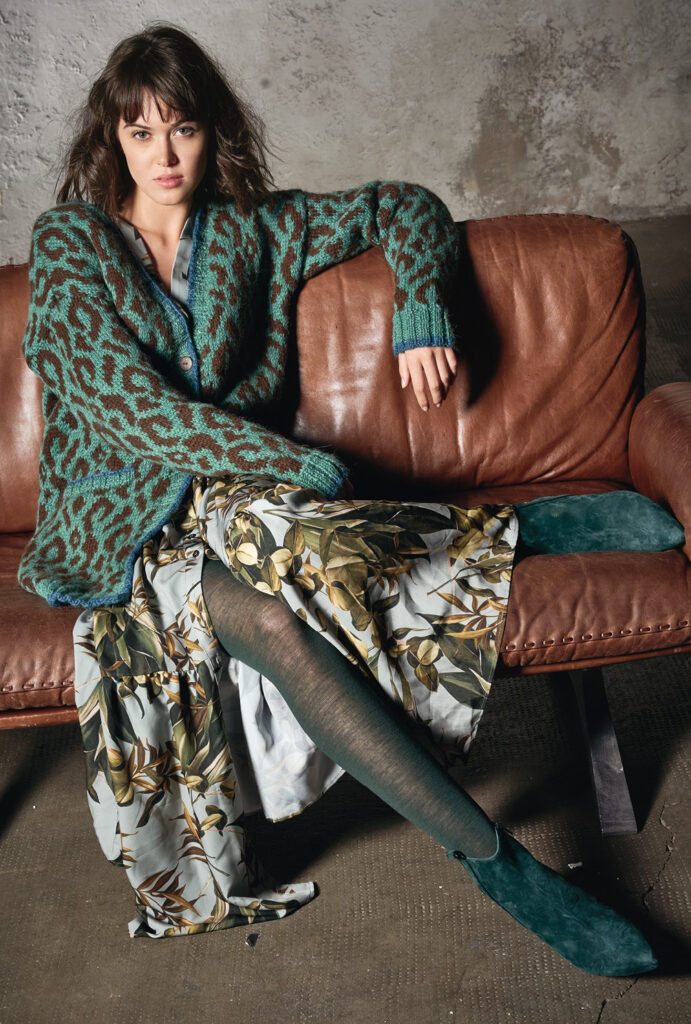 Gestrickt wird unser Cardigan in Leo-Optik in Einzelteilen und bis auf die Rippenblenden allover im Jacquardmuster. Begonnen wird mit dem Rückenteil, dann mit den Taschenbeuteln – den die werden bei den Vorderteilen direkt mit eingestrickt. Sind auch die Ärmel geschafft, geht es an die Ausarbeitung: Die Taschen erhalten ihre Blende, die Taschenbeutel werden innen angenäht. Die Schulternähte werden geschlossen, die Maschen aus den Ausschnitträndern und Kanten aufgefasst und auch hier die Blenden inklusive Knopflöcher gestrickt. Dann noch die restlichen Nähte schließen und die Knöpfe anbringen.