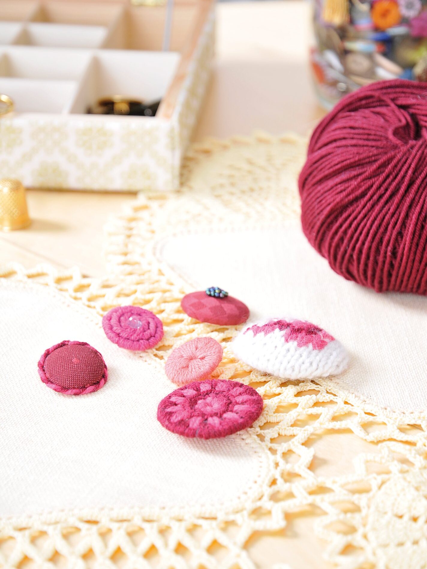 Passend zum Kleidungsstück lassen sich entsprechende Knopfrohlinge auch mit Stoffen oder Strick beziehen und mit Perlen und Stickerei ganz individuell gestalten. Der Phantasie sind keine Grenzen gesetzt. Im Fachhandel findest du Knopfschablonen, die mit Garn umstochen oder umhäkelt werden können. Und natürlich lassen sich Knöpfe auch filzen.