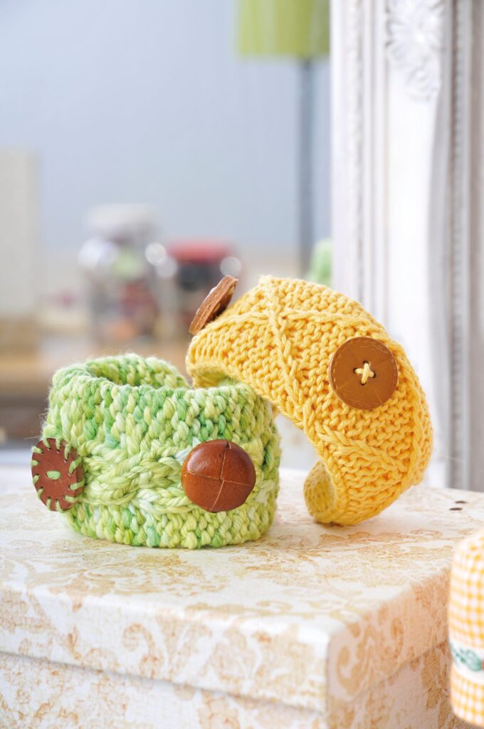 Wenn du gerade an einer Jacke stricken und dir über die Knöpfe noch nicht im Klaren bist, wie wäre es mit geknoteten Knöpfen? Stricke aus dem gleichen Garn, dass du für deine Jacke verwendet hast, einen schmalen Streifen, gerade so lang, dass er geknotet werden kann. Mit den beiden Enden, die möglichst kurz sein sollten, nähst du den „Knotenknopf“ an die Blende. Für diese einfachen, aber wirkungsvollen Knöpfe sollte das Garn nicht zu dünn und weich sein. Gut eignen sich Baumwolle und Schurwolle.