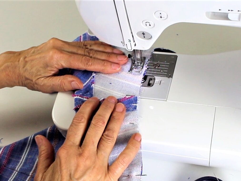 Hals-und Armausschnitte werden gebügelt, die Seitennähte werden gesteppt und die Besätze versäubert.