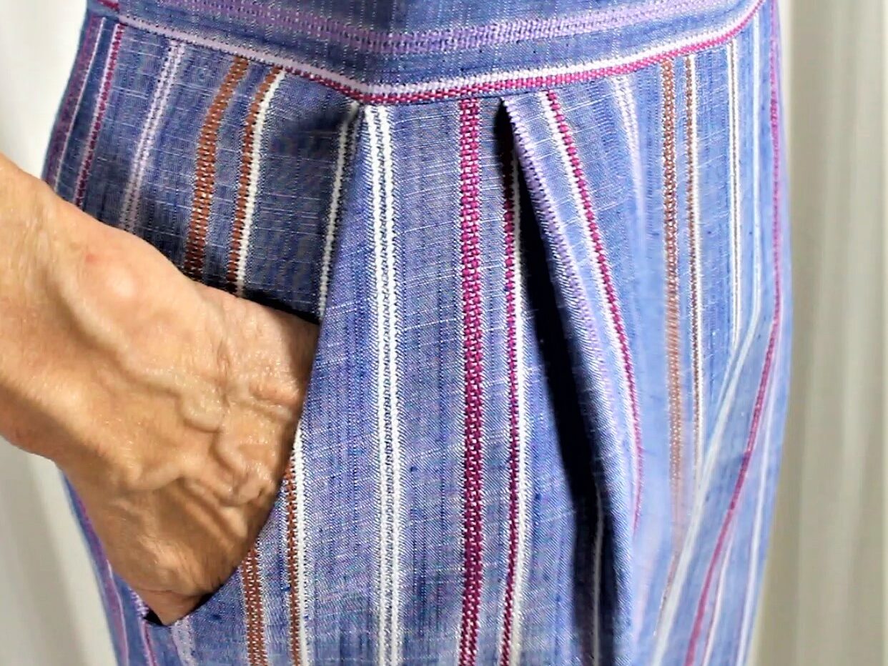 Die Tascheneingriffe werden verstürzt, gebügelt und die Taschen fertig genäht. Die Bundfalten werden eingelegt.