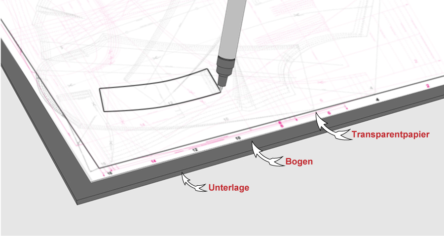 Um die auf dem Bogen abgebildeten Schnittteile beim Zuschnitt auf den Stoff auflegen zu können, muss erst jedes Schnittteil auf ein gesondertes Stück Papier übertragen werden. Hierfür bieten sich zwei unterschiedliche Methoden an. Für das «Ausradeln» wird ein besonderes Werzeug benötigt, für das «Abpausen» nur Transparentpapier und ein Zeichenstift.