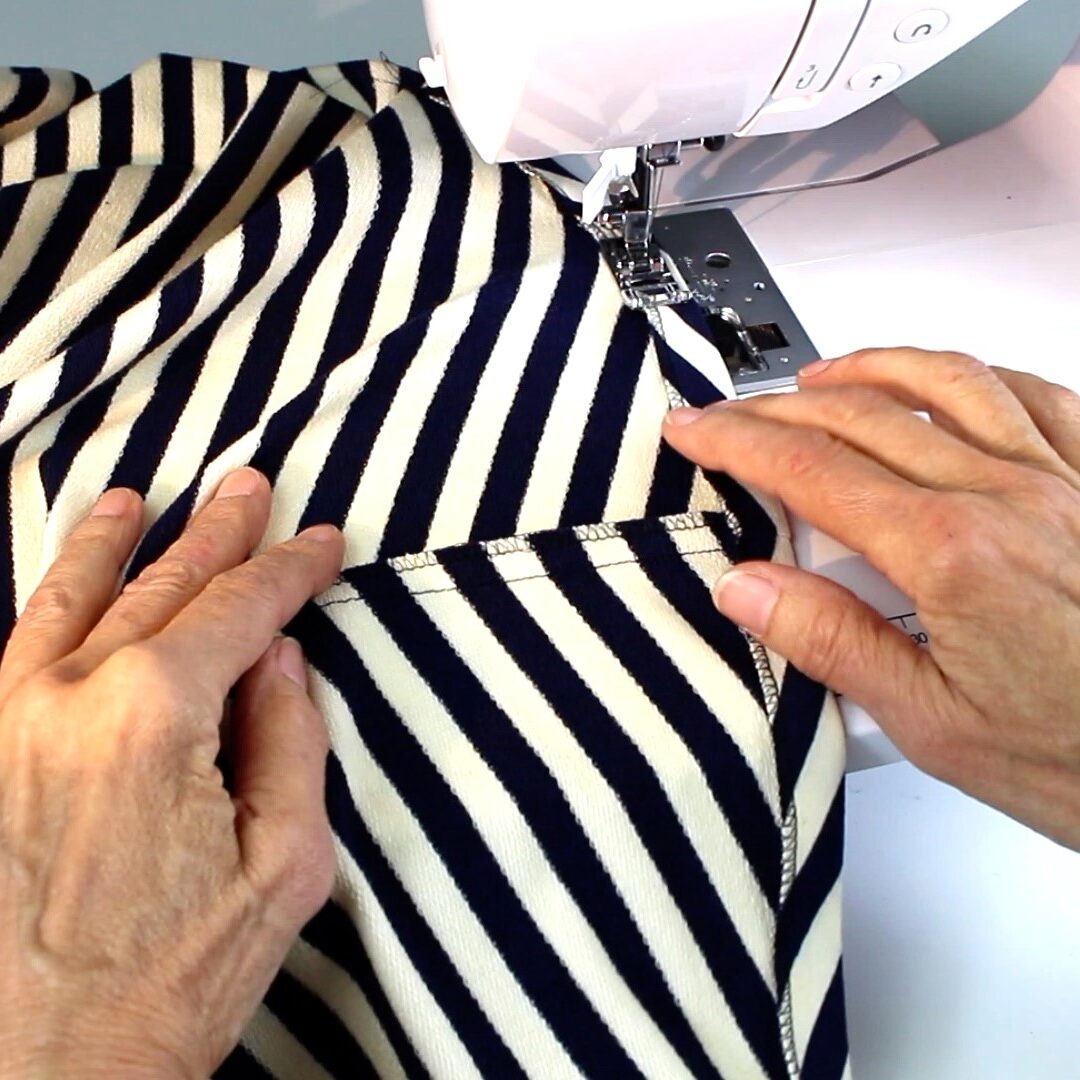 Der Halsausschnitt wird mit einem Streifen eingefasst und wie das sehr gut gelingt zeigt dir Mia wieder in Großaufnahme. Dann wird die zweite Schulternaht gesteppt, die Armabschluss-Säume gebügelt und offen angesteppt. Danach wird der Saum umgebügelt.