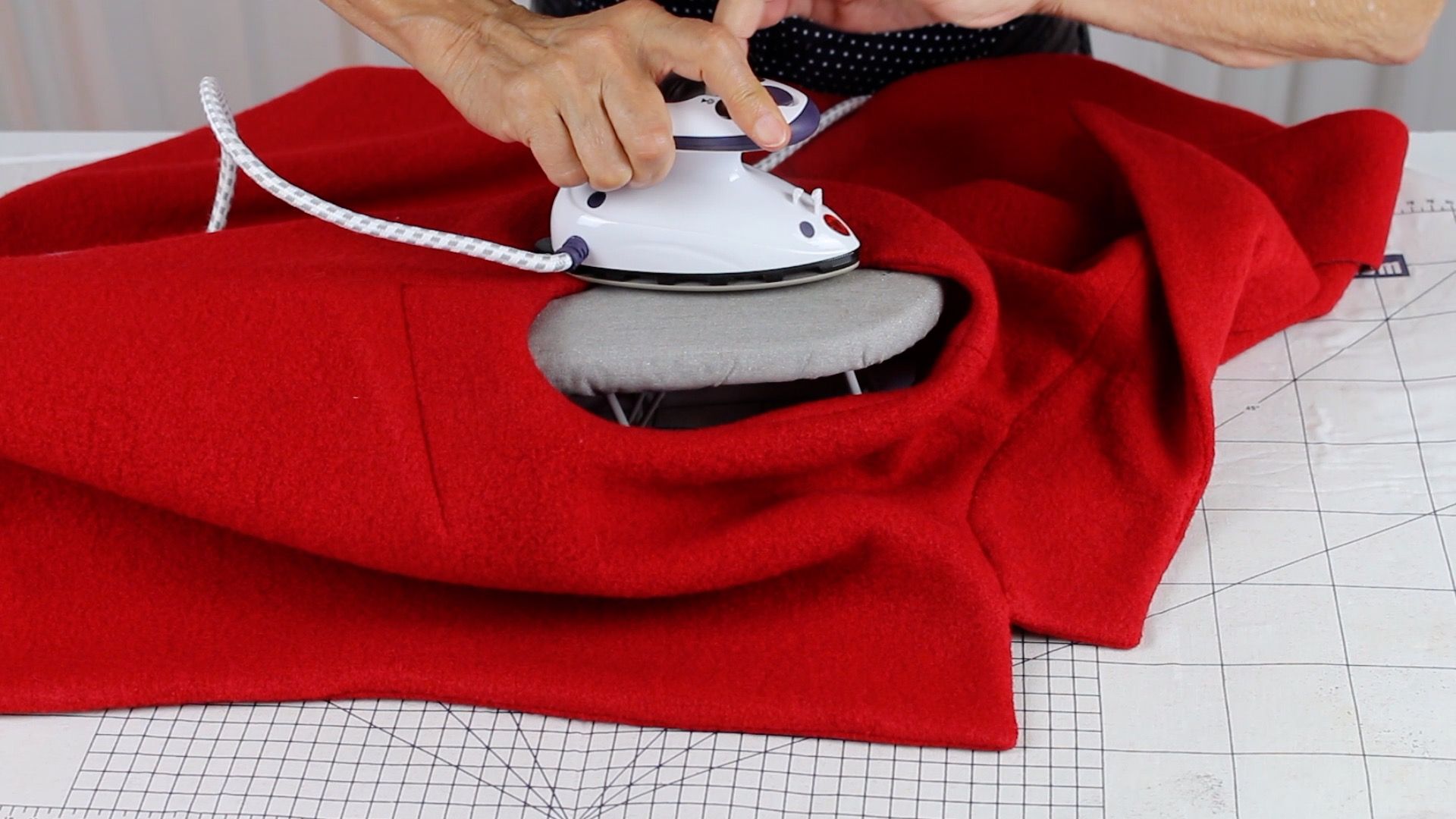 Die Armausschnitte werden mit Besätzen verstürzt und gebügelt.