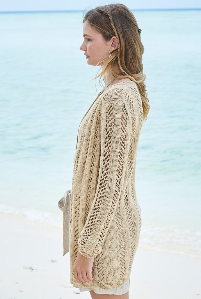 Kurz zu lang, das ist der neue Lagenlook! Die verschlusslose Jacke brilliert mit schmalen Lochmusterstreifen, die beim bauchnabelfreien Top nur seitlich zum Einsatz kommen. Gestrickt werden alle Teile einzeln und von unten nach oben. Der Cardigan erhält dabei ein allover Ajourmuster, welches nicht schwierig zu stricken ist. Die übersichtliche Strickschrift in der Anleitung hilft zudem dabei, stets die Übersicht zu behalten. Die Blenden werden ganz zum Schluss kraus rechts angestrickt, nachdem alle Nähte geschlossen wurden. Das Bustier wird auch in zwei Teilen gestrickt, wobei die glatt rechts gestrickten Maschen seitlich von einem schmalen Ajourmusterstreifen eingerahmt werden. Am besten nimmt das Set dann noch ein kleines Bad und wird schön glatt ausgestrichen und liegend getrocknet. Dabei entfaltet das Ajourmuster seine volle Schönheit.