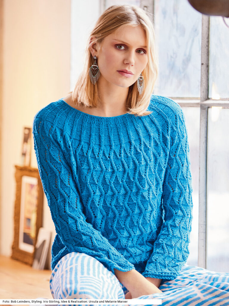 Ein edles Garn aus reiner Seide, dazu ein schwungvolles Ajourmuster und kräftiges Türkis sind wie eine frische Meeresbrise. Durch das softe Naturgarn ist der Pulli herrlich leicht und anschmiegsam. Vorder-, Rückenteil und Ärmel werden bis zu den Armausschnitten separat gestrickt, dann werden die Teile zusammen auf eine Rundstricknadel genommen und die Passe in Runden fortgesetzt. Besonders schön verlaufen die «Schnüre» des Musters als Rippen bis zum runden Halsausschnitt weiter. Alle Bündchen haben ein schmales Lochmuster. Die Anleitung kann für die Größen 36/38, 40/42 und 44/46 downgeloadet werden.