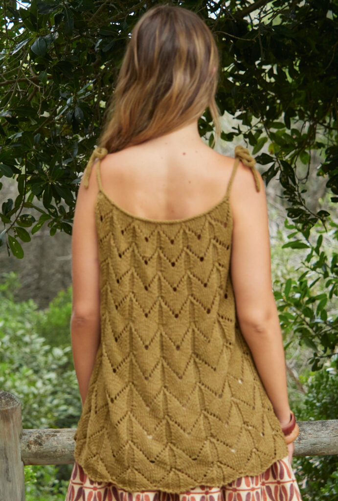 Das Ajourmustertop mit gestrickten Kordel-Trägern erhält seine charakteristische A-Line durch Abnahmen innerhalb des Musters. Hierfür werden einfach die Umschläge weggelassen, so dass das jeweils nachfolgende Ajourmuster automatisch schmaler wird. Also gar nicht aufwendig zu stricken. Das sommerliche, weiche Baumwollgarn in Oliv schmeichelt der Haut. Tipp: Mutige tragen nichts darunter, wer nicht ohne gehen mag, nimmt einen trägerlosen BH, der das schöne Dekolleté, die durch die schmalen Spaghettiträger gebildet wird, nicht stört. Die Anleitung steht in den Größen 36/38, 42/44 und 48/50 zur Verfügung.