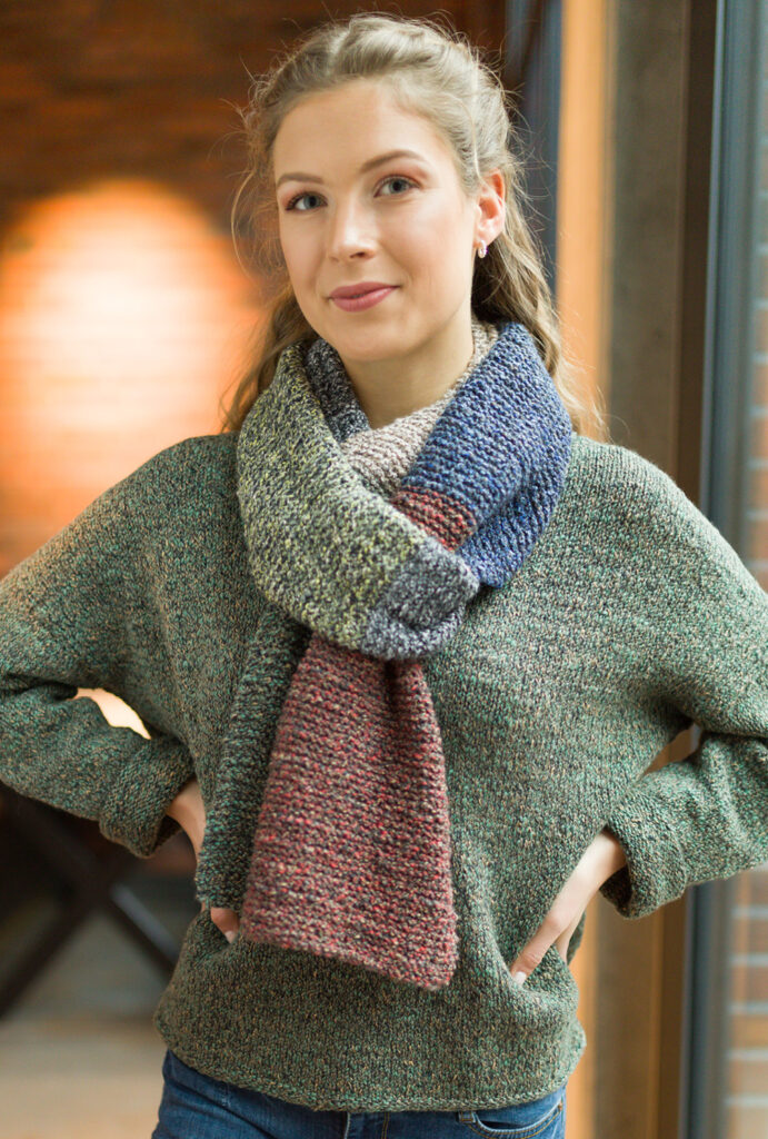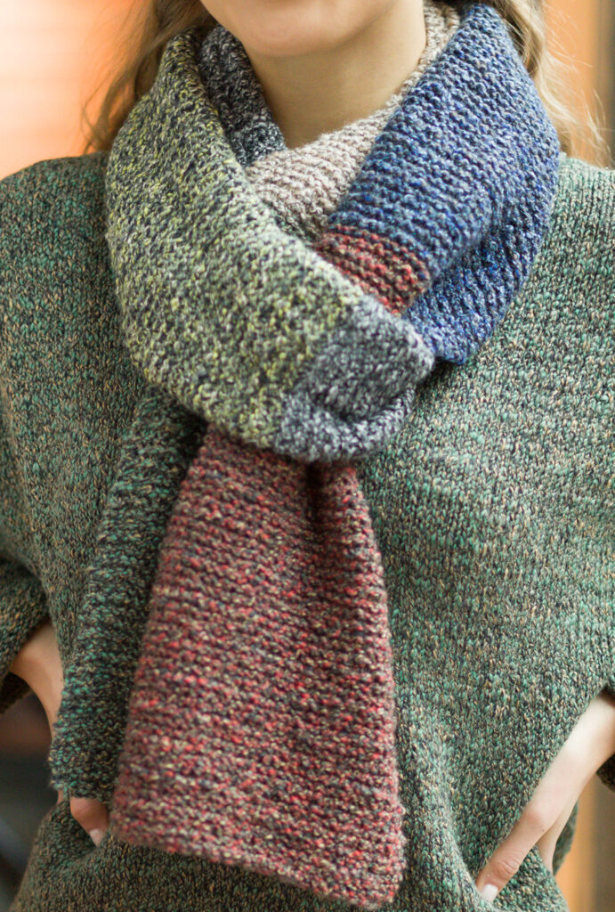 Die ganze harmonische Farbpalette des mehrfarbigen Effektgarns gibt sich bei diesem Kuschelschal ein modisches Stelldichein. Es sind so wohlklingende Namen wie Sand, Glut, Mineral, Jade, Meer und Grau. Dieser Schal ist exakt das Richtige für Strickneulinge. Hier werden mit Nadeln Nr. 5,5 ausschließlich rechte Maschen gestrickt – also kraus rechts – und von jeder Farbe 30 cm. Diese 180 cm lassen sich dann mehrmals um den Hals schlingen. Die Anleitung gibt es für eine Größe von 30 x 180 cm.