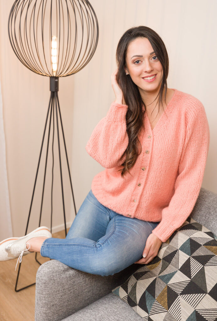 Mit doppeltem Faden von oben nach unten glatt rechts gestrickt – die Raglanjacke wird trotz feinem, edlem Lacegarn zügig fertig. Rippenblenden mit I-Cords als Abschluss runden das Design ab. Sie werden auch an der rundum gestrickten Knopfleiste so gearbeitet. Locker in der Weite und schlicht im Ausdruck kann der melonefarbene Cardigan gern auch als Pulli, ohne T-Shirt oder Bluse darunter, getragen werden. Die Anleitung steht zum Download bereit in den Größen 36/38, 40/42, 44/46 und 48/50.