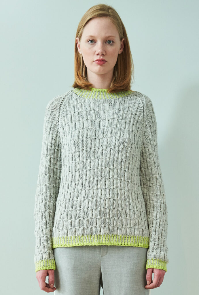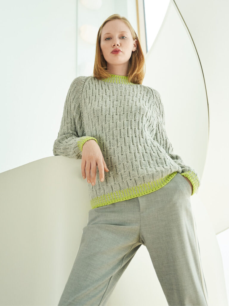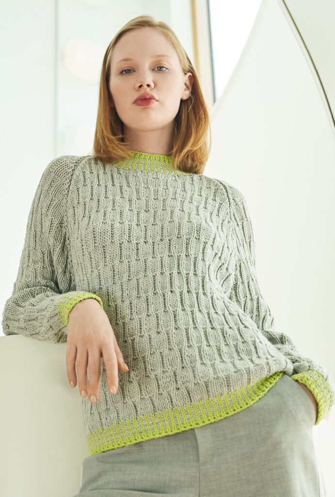 Anfängerfreundlich: Die Wabenstruktur dieses sportiven Raglanpullis entsteht einfach aus rechten und linken Maschen. Und auch die zweifarbigen Bündchen sind kein Hexenwerk, die unbenutzte Farbe wird einfach auf der Arbeitsrückseite mitgeführt. Mit Nadelstärke 5 und reiner Schurwolle strickt es sich zudem ganz entspannt und zügig. Gestrickt wird in einzelnen Teilen von unten nach oben. Das effektvolle Strukturmuster besteht aus einem Rapport von sechs Maschen und ist ausführlich Reihe für Reihe in der Anleitung beschrieben. Sind alle vier Teile fertig gestrickt, werden noch alle Nähte geschlossen und aus dem Halsausschnitt die schmale Blende im Rippenmuster herausgestrickt.