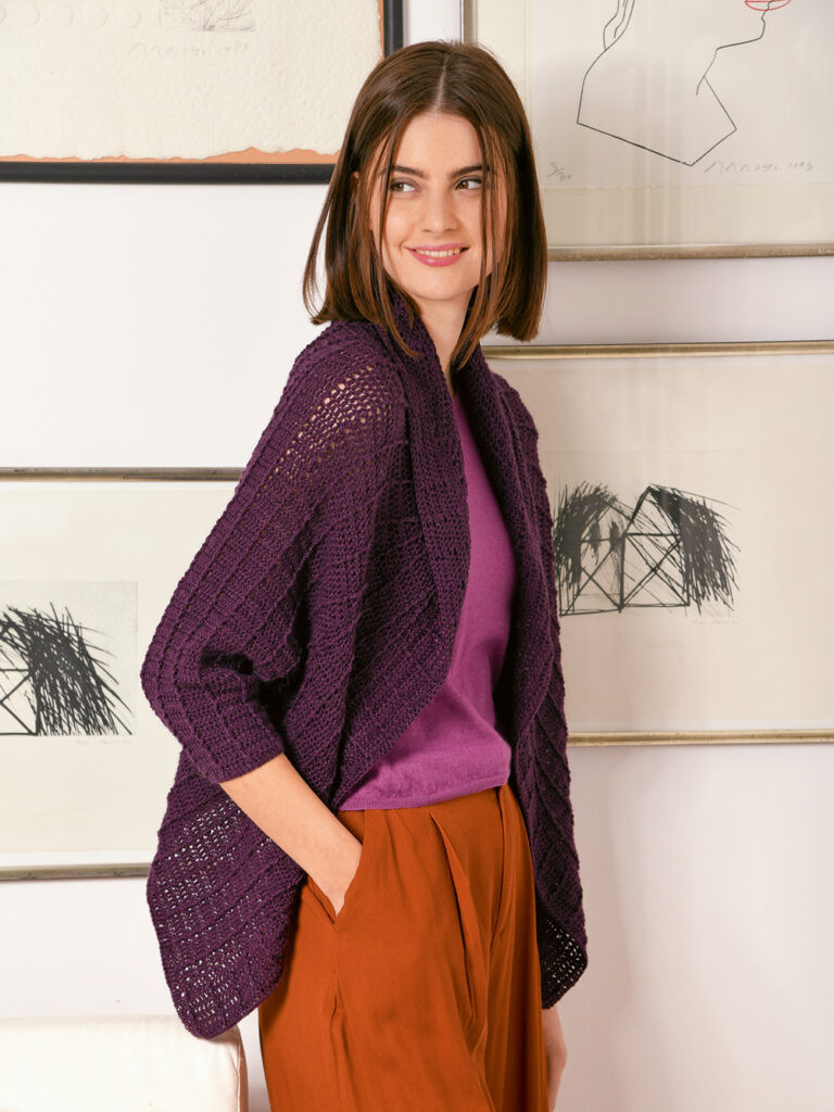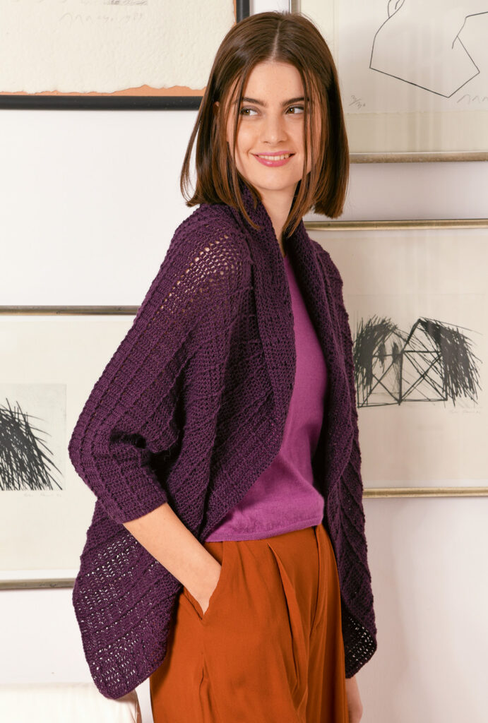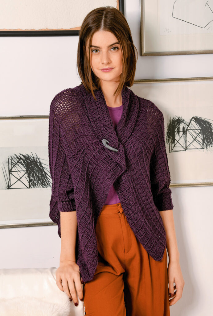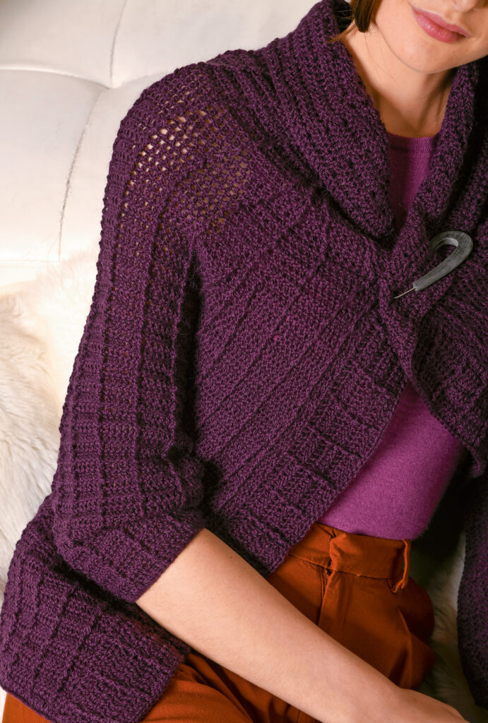 Häkeltrends Auberginefarbene, gehäkelte Raglanjacke im Stäbchenrippenmuster