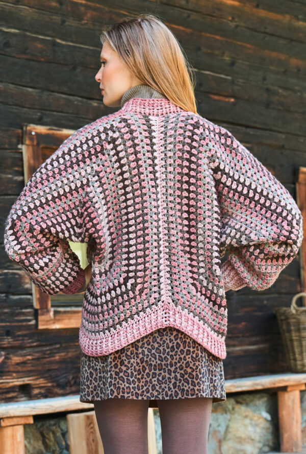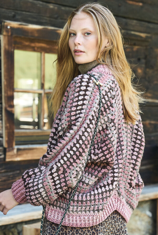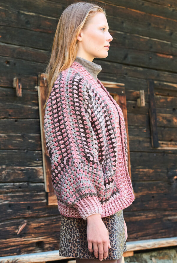 Was für eine außergewöhnliche Jacke! Das Muster setzt sich aus Stäbchen und Reliefstäbchen zusammen. Durch die Reliefstäbchen entsteht die Rippenoptik. Es sind doppelte Stäbchen die in den Hinreihen von vorne und in den Rückreihen von hinten um den Kopf des darunter liegenden Stäbchen gearbeitet werden. Das ist nicht weiter schwierig, nach ein paar Reihen hast du das Muster verinnerlicht. Besonderes Augenmerk liegt hier auf dem Schnitt. Der untere Teil ist relativ kurz, dafür ist die Raglanschrägung um so tiefer. Hier musst du genau nach Anleitung arbeiten. Du häkelst über alle Maschen und nimmst betont an 8 Stellen ab. Auch hier spielen die Reliefstäbchen wieder eine Rolle. Zum Schluss umhäkelst du für die Blenden noch den Ausschnitt und die Vorderteilkanten. Du arbeitest mit einer Häkelnadel Nr 3,5 und Garn von ggh. In der Anleitung findest du die Größen 36, 38, 40, 42, 44 und 46.