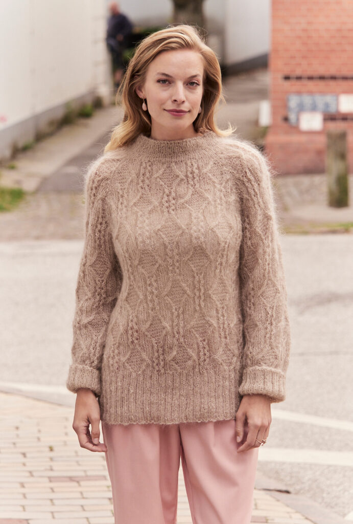 Dieser federleichte Pullover mit Stehkragen lebt von seinem markanten Strukturmuster aus Zöpfen und Ajourmuster. Das flauschige Mohairgarn mit etwas Polyester-Beimischung hat einen zarten, hellbeigen Farbton. Durch die Raglanärmel sitzt dieses Modell perfekt an den Schultern. Extrabreite 2/2-Rippenbündchen sowohl am Saum als auch an den Ärmelrändern sehen auch als umgeschlagene Manschette bei den Ärmeln gut aus. Der Schnitt ist figurbetont, gleicht jedoch kleine Pölsterchen durch die hüftlange Form diskret aus. Die Anleitung für dieses Modell gibt es für die Größen 36/38, 40/42 und 44/46.