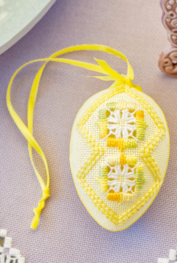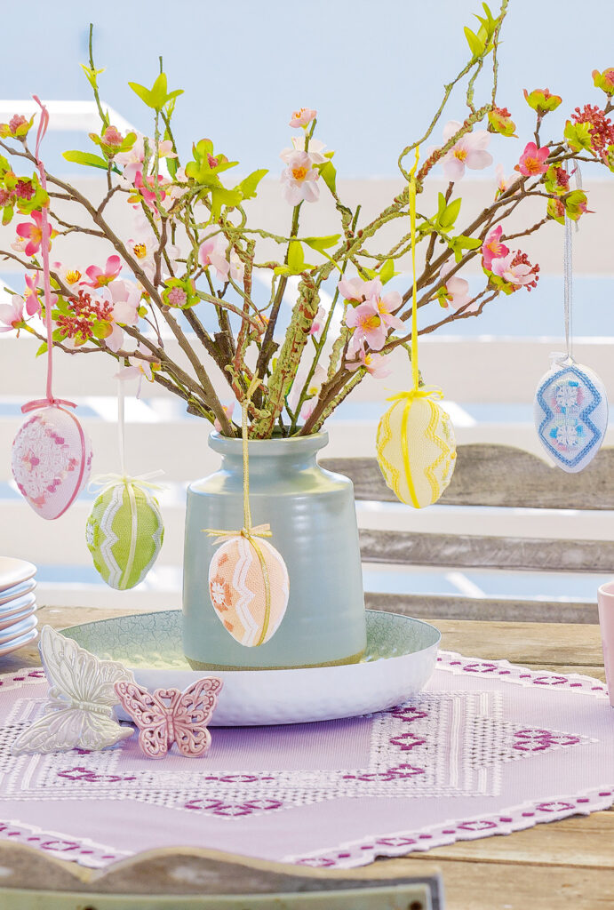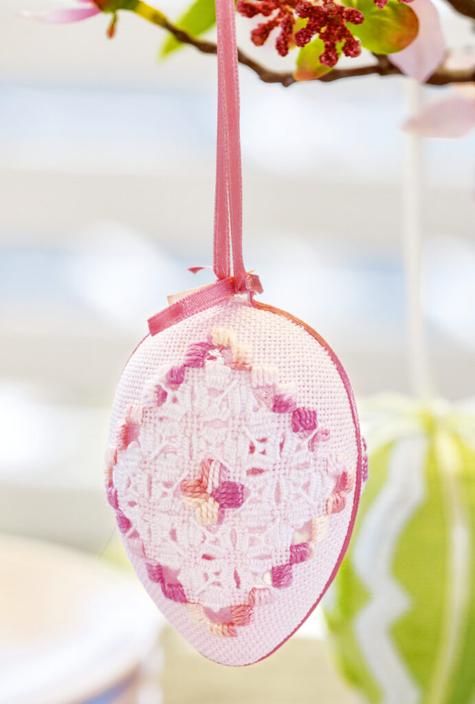 Hardanger ist eine traditionelle Sticktechnik aus Skandinavien, die durch spezielle Doppeldurchbrüche charakterisiert ist und sich auch gut für Kissen, Tischdecken und Läufer eignet. Hier werden mit dieser Technik Ostereier aus Plastik aufs Feinste veredelt. Die auf diese Weise kunstvoll bestickten Eier eignen sich für den Osterstrauß ebenso wie als besondere Tellerdekoration auf der Ostertafel. Nach dem Sticken werden die Eier Stück für Stück mit der Hardanger-Stickerei beklebt. Das Nacharbeiten ist für erfahrene Stickerinnen geeignet, aber dank der ausführlichen Anleitung und der beigefügten Schema- und Werkzeichnungen problemlos möglich.
