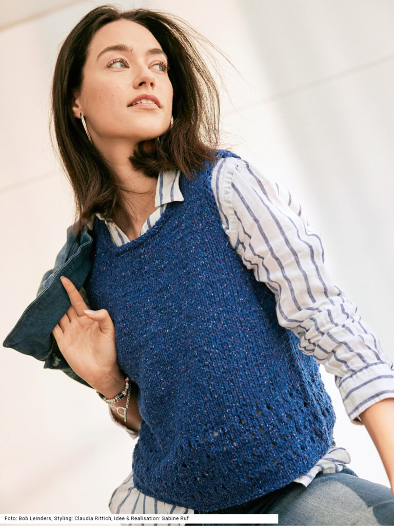 Das modisch kurz geschnittene Top im cropped Style ist derzeit absolut angesagt. Ein paar Lochmusterreihen am unteren Ende, ansonsten ganz glatt rechts gestrickt, stellen auch für Neulinge mit wenig Erfahrung keine unüberwindbare Hürde dar. Das Modell ist vielseitig, denn es empfiehlt sich nicht nur für den Sommer zum Solotragen, sondern auch für den Winter als Pullunder. Es ist aus einer Mischung von Schurwolle, Polyamid und Seide in einem starken Blau gearbeitet. Es gibt die Anleitung zum Downloaden für die Größen 36/38, 40/42 und 44/46.