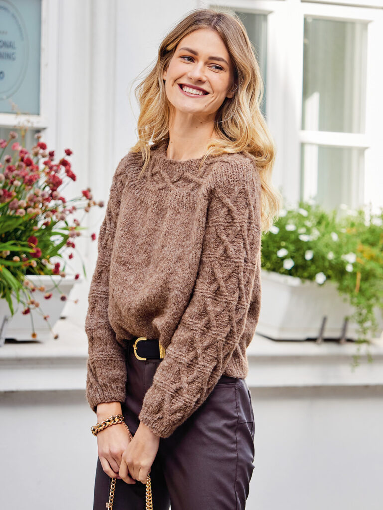 Ein Pullover aus Schurwolle-Alpaka-Mischgarn mit bemerkenswerten Details: Vorder-, Rückenteil und Ärmel werden zunächst mit kurzen Raglanschrägen separat gearbeitet, dann für die Rundpasse zusammengefügt und in Runden fortgesetzt. Alle Teile sind hauptsächlich glatt rechts gestrickt, die Ärmel bekommen dazu in regelmäßigen Abständen drei Querlinien aus kraus rechts gestrickten Maschen. Die Rundpasse beginnt zunächst mit einigen Zentimetern 1/1-Rippen, gefolgt von Zopfmuster in gekreuzten Linien und für die Ausschnittblende nochmals 1/1-Rippen. Wer mag, lädt sich die Anleitung für die Größen 36/38, 40/42 und 44/46 herunter.