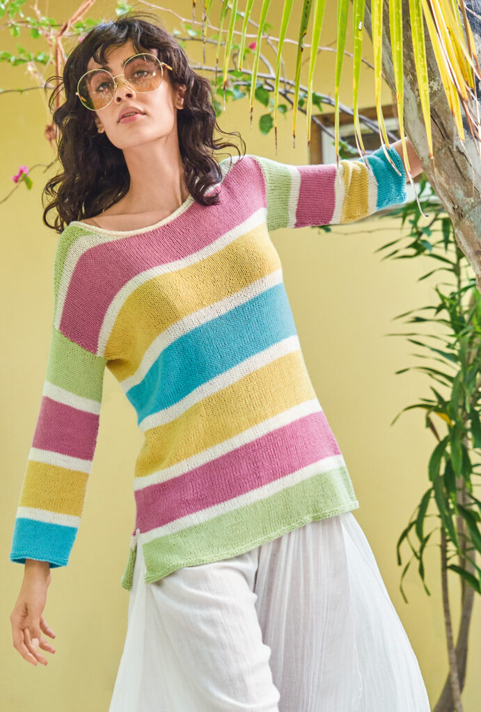 Streifen für Streifen entsteht hier ein Pulli, bei dem Du einfach glatt rechts stricken und Dich ganz dem Farbspiel von Limone, Wasserblau, Pink und Lindgrün hingeben kannst. Das wunderbare Garn aus weicher Baumwolle mit kleinem Anteil von flauschigem Baby Alpaka gleitet dabei so angenehm und leicht fließend über die Nadeln, dass die Haptik im Zusammenspiel mit den Farben uns einmal mehr verstehen lässt, warum stricken Wellness ist! Gestrickt wird von unten nach oben, wobei das Vorderteil und das Rückenteil erst einmal einzeln gestrickt werden. Nachdem die Höhe der Seitenschlitze erreicht ist, werden beide Teile gemeinsam in Runden bis zur Höhe der Armausschnitte gestrickt. Dann geht es wieder in Hin- und Rückreihen weiter, der Halsausschnitt und die Schultern werden geformt. Nun noch die Ärmel stricken, dann geht es auch schon an die Ausarbeitung. Die Nähte werden geschlossen, die Halsausschnittblende angestrickt und die Seitenschlitze mit Krebsmaschen umhäkelt. Dabei wird es dann auch schon Zeit, sich über die Farben des nächsten Streifenpullis Gedanken zu machen…