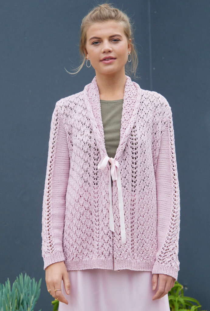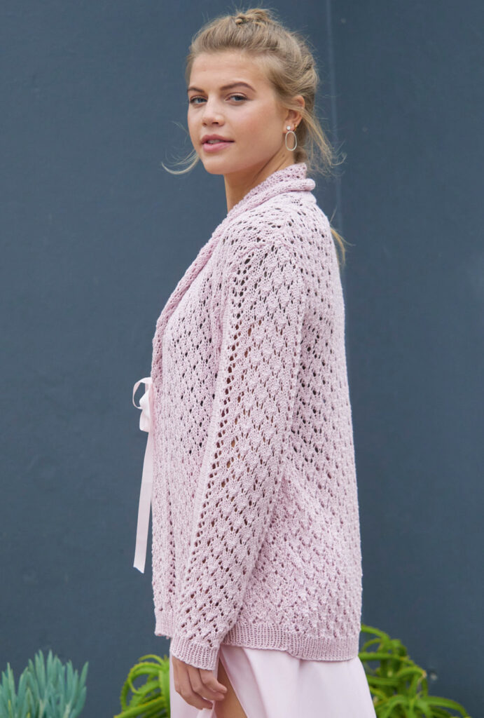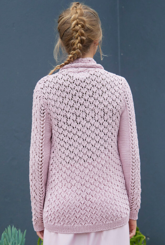 Bei dieser hüftlangen roséfarbenen Jacke aus 100 % Baumwolle läuft das einfache Ajourmuster auch im Schalkragen weiter. Automatisch rollt sich die Außenkante des Schalkragens leicht auf, was einen zusätzlich schicken Effekt ergibt. Ein sehr feminines Modell, das auch zu festlichen Anlässen gut passt. Die Ärmel sind klassisch mit Armkugel geschnitten, auf diese Weise sitzt die Jacke an den Schultern perfekt. Als Verschluss wird ein rosafarbenes Ripsband eingesetzt, die Höhe kannst du individuell festlegen. Die Anleitung hierfür steht in den Größen 36/38, 40/42 und 44/46 zur Verfügung.