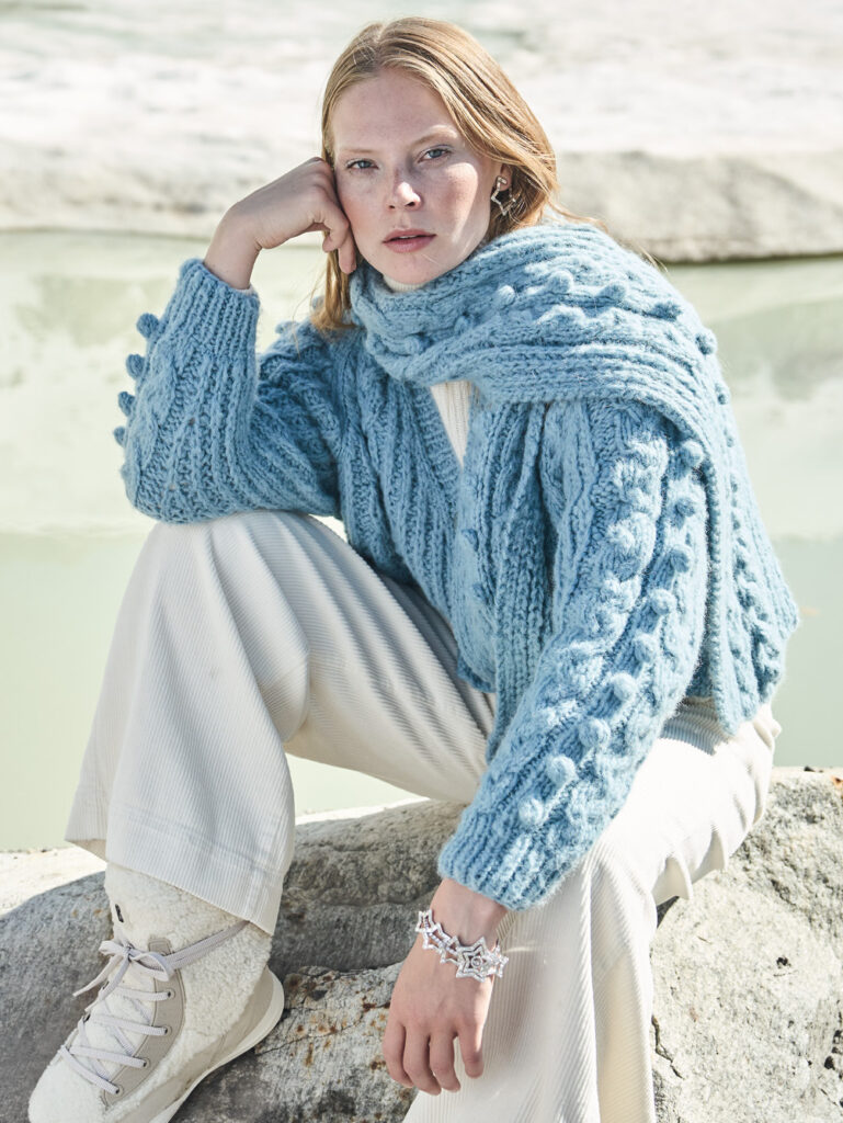 Wie praktisch, wenn zur Strickjacke mit Raglanschrägungen auch gleich der passende Schal mitgeliefert wird. Denn der V-förmige Ausschnitt der Jacke ist recht tief angelegt, sodass etwas Schutz und Wärme für die Hals- und Schulterpartie von Vorteil ist. Beide Teile bestehen aus einem voluminösen, aber leichten Schurwoll-Alpakagarn und zeichnen sich durch ihr Spiel aus Patentrippen, Zöpfen und Noppen aus. Fazit: Mit diesem kuschenweichen Set kann der Winter kommen!