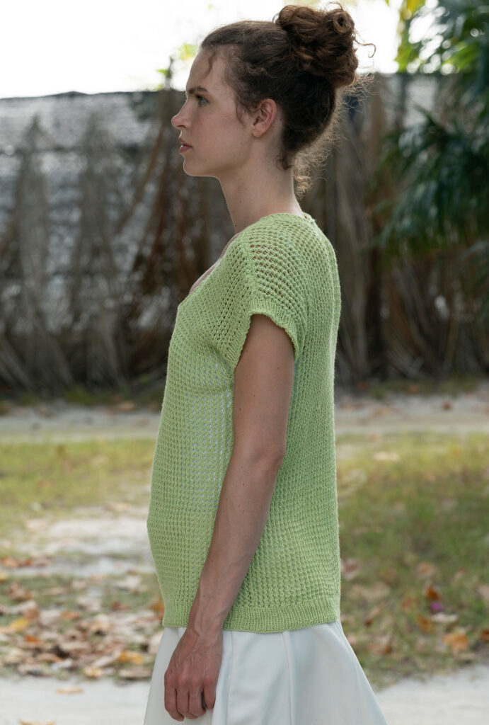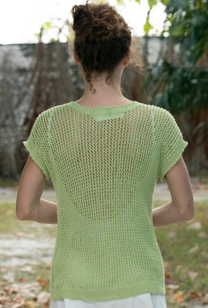 Schön luftig, dabei alltagstauglich und tragbar: Das grüne Top ist aus Baumwolle mit einem geringen Anteil von Alpakafasern – diese sorgen für den soften Griff und den lässigen Fall. Hinzu kommen die luftigen Netzstrukturen, die einfach nachzuarbeiten sind und von schmalen Rippenblenden eingerahmt werden. Tipp: Bei kühleren Temperaturen kannst Du das Teil mit einem Langarm-Shirt kombinieren und so zum aparten Pullunder verwandeln.