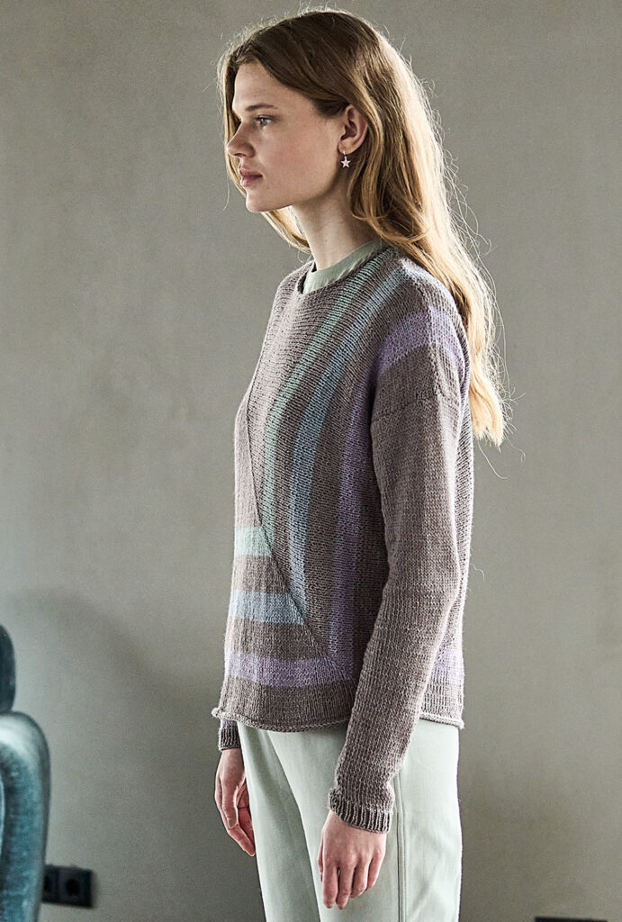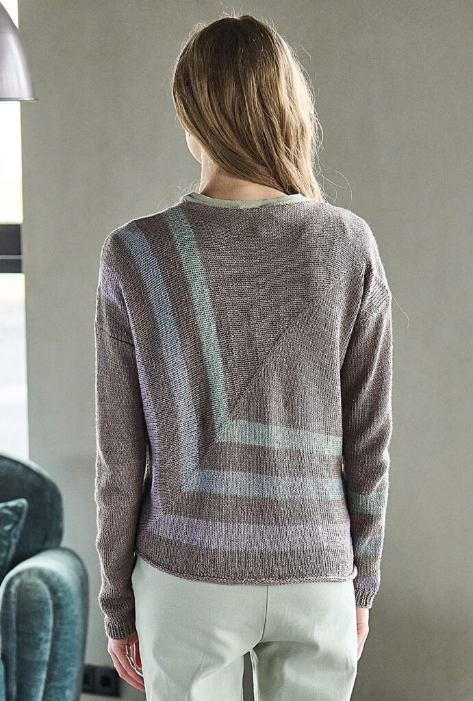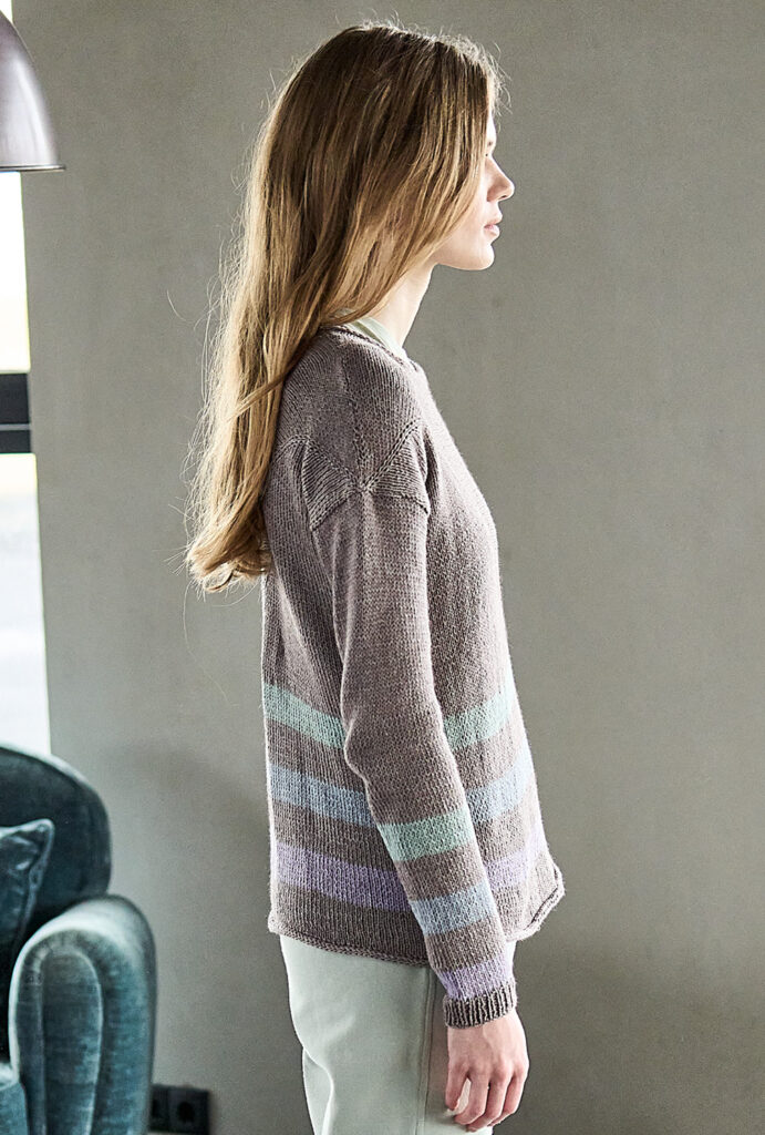 Das Vorder- und Rückenteil dieses gestreiften Pullis in dezenter Farbgestaltung wird mit drei Maschen an der oberen Ecke begonnen und glatt rechts gestrickt. Die diagonale Linienführung erreichst du durch Zunahmen in der Mitte. Sobald ein Quadrat entstanden ist, kannst Du die Arbeit beenden. Dann die Teile um 45 Grad drehen und die Schulternähte schließen. Die Ärmel mit Rippenbündchen stricken und alles zusammennähen. Die Hals- und Saumblende wird im I-Cord-Verfahren genadelt, das heißt mit der Rundstricknadel zwei Maschen glatt rechts stricken und eine Maschen aus den Kanten auffassen. Das geht mit ein bisschen Übung ganz flott und ergibt eine perfekten Abschluss.