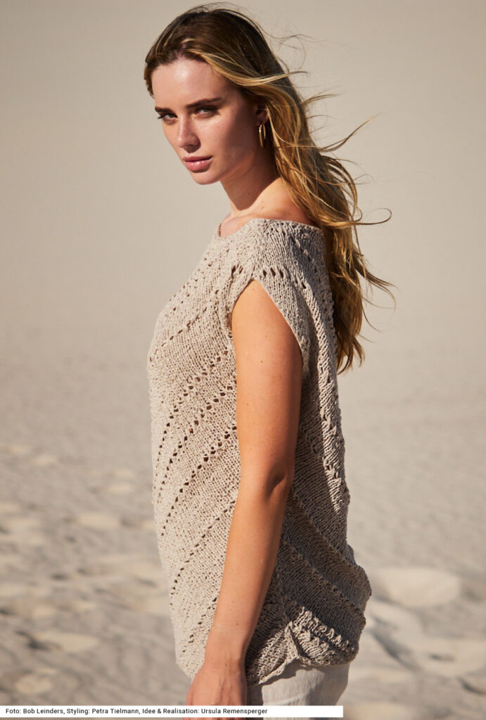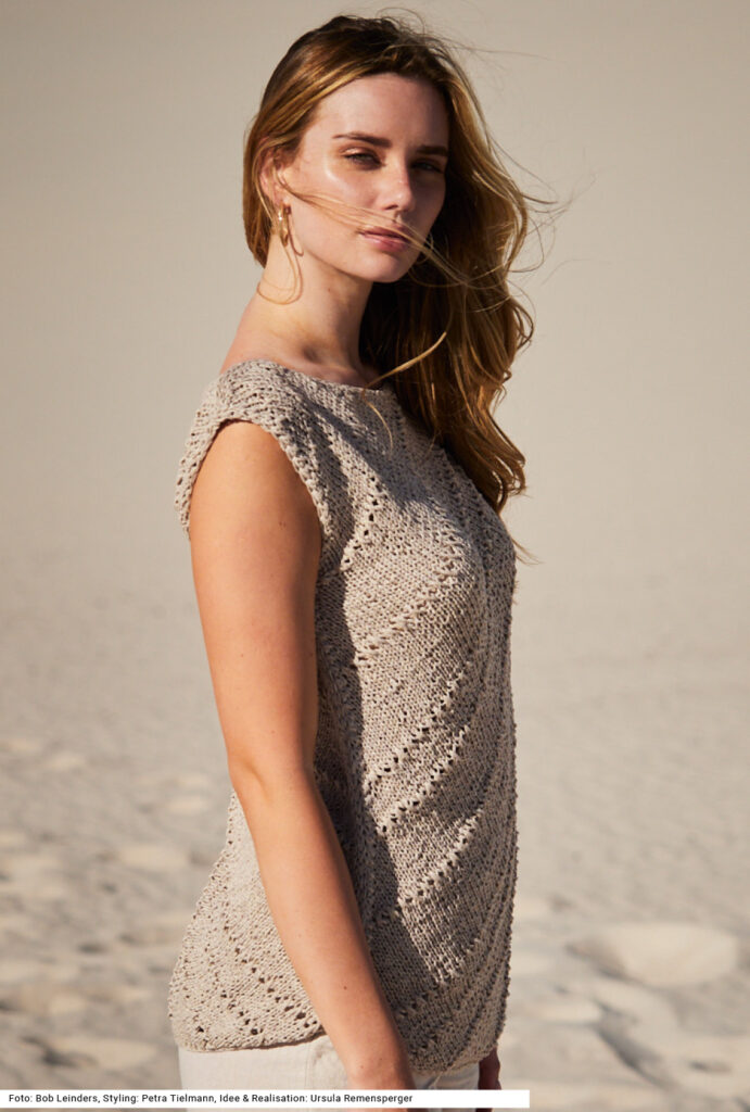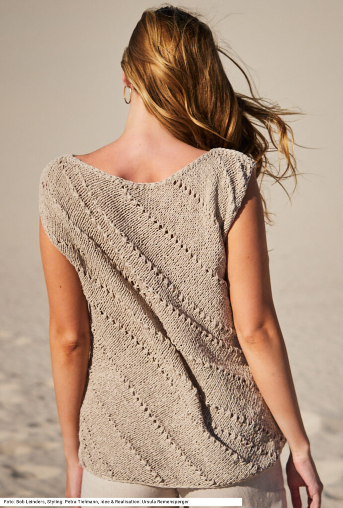 Diagonal stricken ist nicht schwer und macht dennoch so viel her. Das schlichte, ärmellose Top mit U-Boot-Ausschnitt eignet sich daher auch für AnfängerInnen, die ihre Kenntnisse erweitern wollen. Schön sehen auch die doppelten Randmaschen aus, sie werden in der Anleitung genau erklärt. Das leinenfarbene Bändchengarn aus halb Baumwolle, halb Polyester fühlt sich an wie Leinen und gibt dem Modell einen etwas robusteren Charakter, der von den diagonalen Lochmusterreihen noch unterstrichen wird. Eine Anleitung gibt es für die Größen 38/40, 42/44 und 46/48.