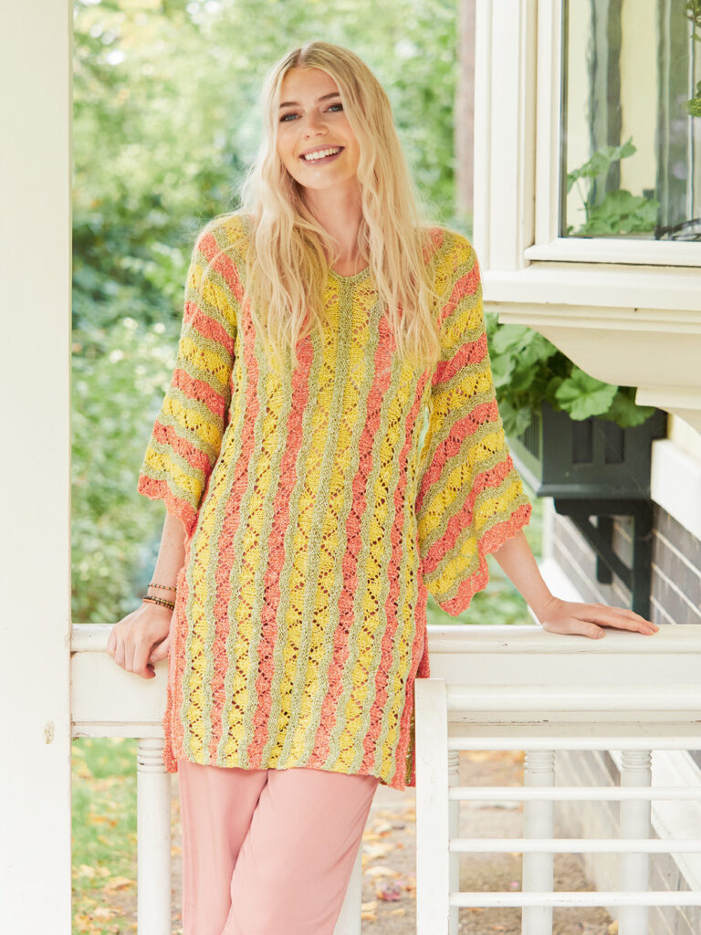 Die dreifarbige Tunika wird in zwei Teilen quer gestrickt – ein toller Dreh, der durch die Längsstreifen zudem immer eine gute Figur macht. Die weiten Ärmel und Seitenschlitze sorgen für jede Menge Bewegungsfreiheit, das Garn aus Baumwolle und Leinen für ein kühles, angenehmes Tragegefühl. So hat die Tunika alles, was die perfekte Begleitung an warmen Tagen ausmacht – egal, ob in der Stadt oder über dem Bikini am Strand. Begonnen wird jeweils am Ärmel, danach werden die stillgelegten Maschen beider Teile in der vorderen und rückwärtigen Mitte im Maschenstich verbunden – die zuvor abgeketteten Maschen des Ausschnitts bleiben einfach unverbunden. Zum Schluss werden noch die hohen Saumschlitze und der Halsausschnitt mit jeweils einer Runde fester und einer Runde Krebsmaschen umhäkelt.
