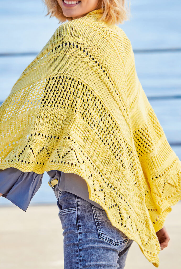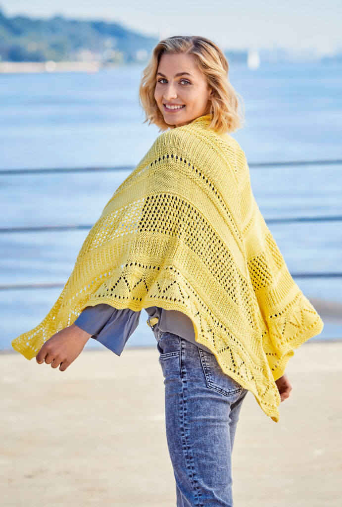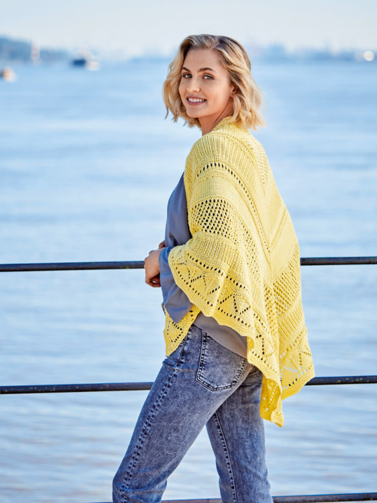 Stimmungs-Booster: Das leuchtende Gelb des schönen, großen Shawls steht nicht umsonst für Wärme, Optimismus und Heiterkeit. Und für Kreativität! Dass davon jede Menge in das Tuch geflossen ist, sieht man nicht nur, sondern man merkt es auch bereits während des Strickens. Lochmuster, Ajourmuster, Lochstreifen und Rippenmuster bieten jede Menge Abwechslung und Strickspaß. Insgesamt benötigt das Kunstwerk zwar ein wenig Aufmerksamkeit, aber die klare Strickschrift in der Anleitung hilft dabei, stets den Überblick zu behalten. Zur besonders einfachen Übersicht sind in der Anleitung zusätzlich die durch die Zunahmen erreichten Maschenzahlen nach jedem Muster angegeben.