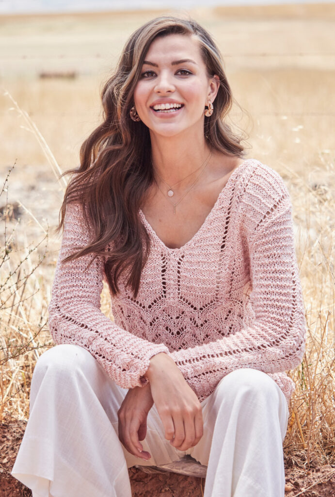 Bedingt durch den geschickt platzierten Mustermix wird dieser Pulli zum absoluten Figurschmeichler. Oben herum wird ein Querrippenmuster mit Lochstreifen kombiniert, unter der Brust beginnt dann das luftige Ajourmuster. Dadurch ergibt sich eine Optik, die fast einer Empiretaille gleicht. Das sommerliche Mischgarn aus Viskose, Leinen und Baumwolle wird doppelt genommen mit Nadel Nummer 4,5 verstrickt und verleiht dem Pullover seinen schönen Fall. Gearbeitet wird ganz klassisch in vier Teilen mit einer schön ausgearbeiteten Armkugel. Die Blende verleiht dem V-Ausschnitt einen feinen, zarten Rahmen.