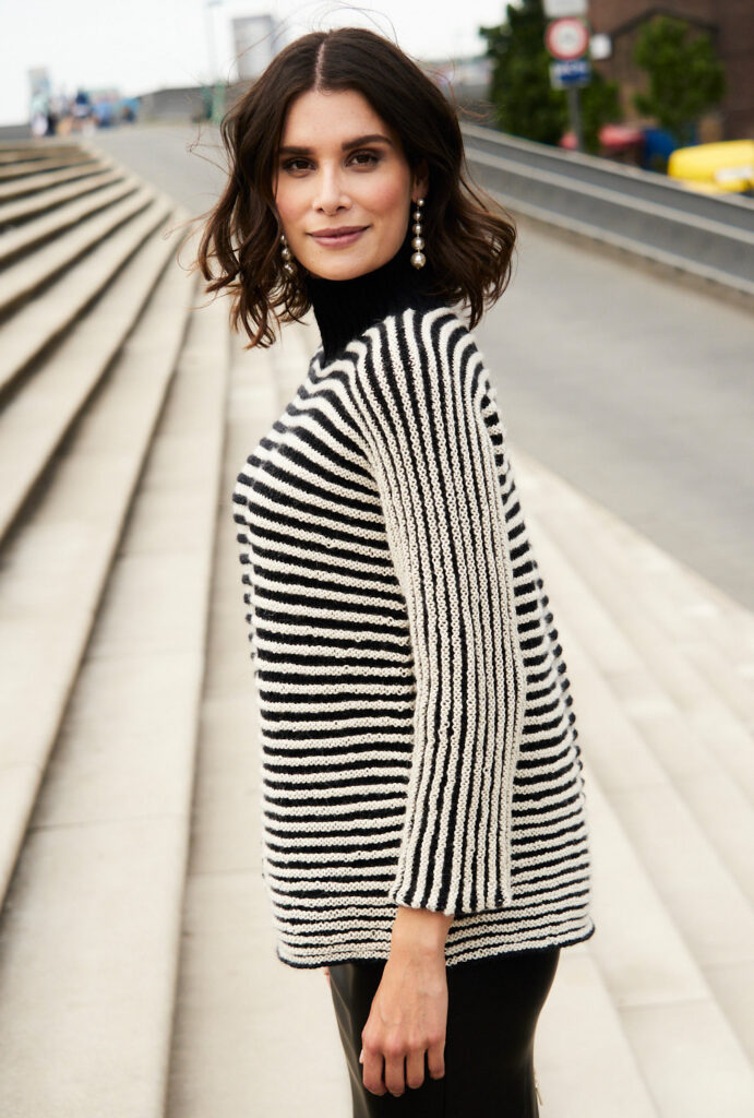 Der Pulli mit Rippenmuster-Streifen wird in einem Stück über die Schultern hinweg gestrickt und wirkt durch den mehrfachen Kontrast zwischen Schwarz & Weiß sehr modern. Diese Art des Musters nennt sich Schattenstricken; in der vorderen und hinteren Mitte treffen sich die Streifen, bleiben zwar in der Farbe gleich, glatt rechts und glatt links wechselt jedoch, wodurch dieser Hoch-tief-Effekt entsteht. Der Rollkragen im Rippenmuster ist ganz ruhig in Schwarz gehalten. Das hochwertige Garn aus Mohair, Lama und Seide hat einen sehr angenehmen weichen Griff. Eine Anleitung gibt es für die Größen 38/40, 42/44 und 46/48.